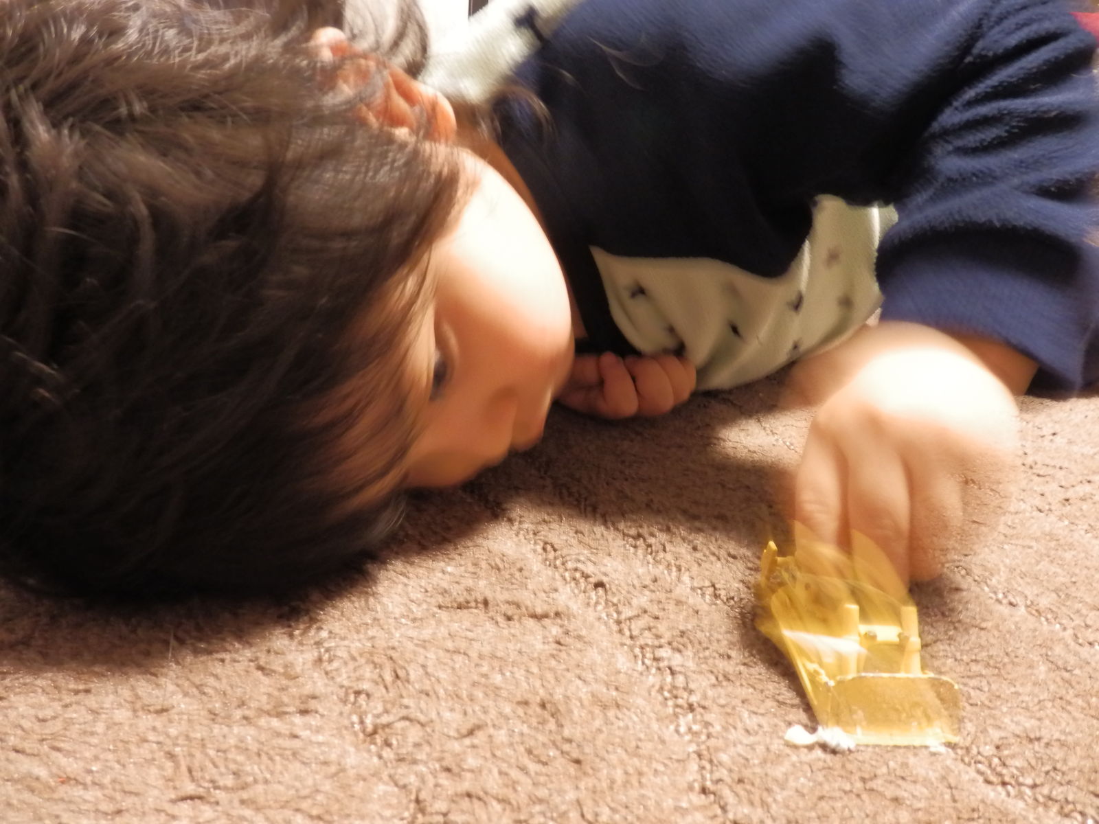 じゅうたんのゴミをかき集めてダンプカーにのせるケイト。