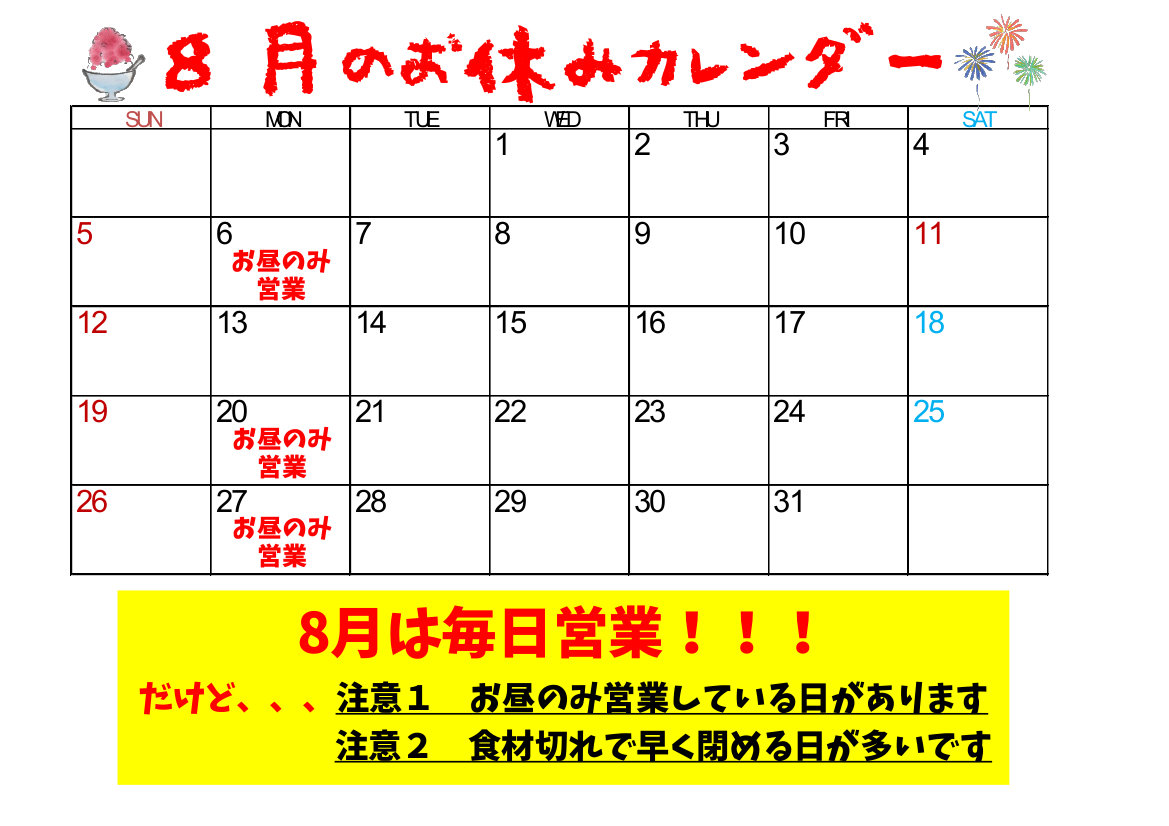 皆さん、夏の予定もあるかと思うのでお休みカレンダーを一足お先に公表します!!