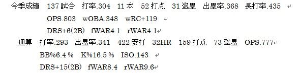 更に今季は四球率が前年比4.0%も向上しており、リードオフマンとして磨きがかかっている。