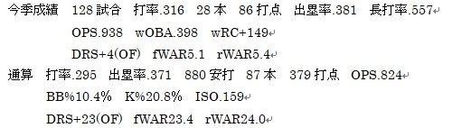 今季は怪我で出遅れたものの長期契約獲得で気を良くしたのか戦列復帰後打ちまくっており、9月2日に30本100打点に到達。