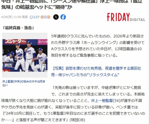 中日・井上監督「シーズン入ったらヤフーニュースも見ないしYouTubeも見ない」
