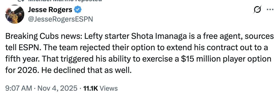 カブス速報:左腕先発投手の今永翔太がフリーエージェントになったと情報筋がESPNに語った。