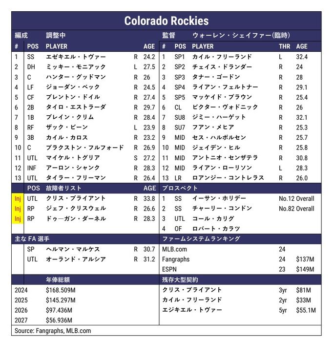2018年以来オーナーであるディック・モンフォートの消極的姿勢により低迷しているコロラド・ロッキーズ。消極的姿勢に加えノーラン・アレナドの契約延長→トレード、必要ないブライアント獲得など悪手も目立っており、瞬間的な勝ち越しシーズンすら生み出せていない状態だ。