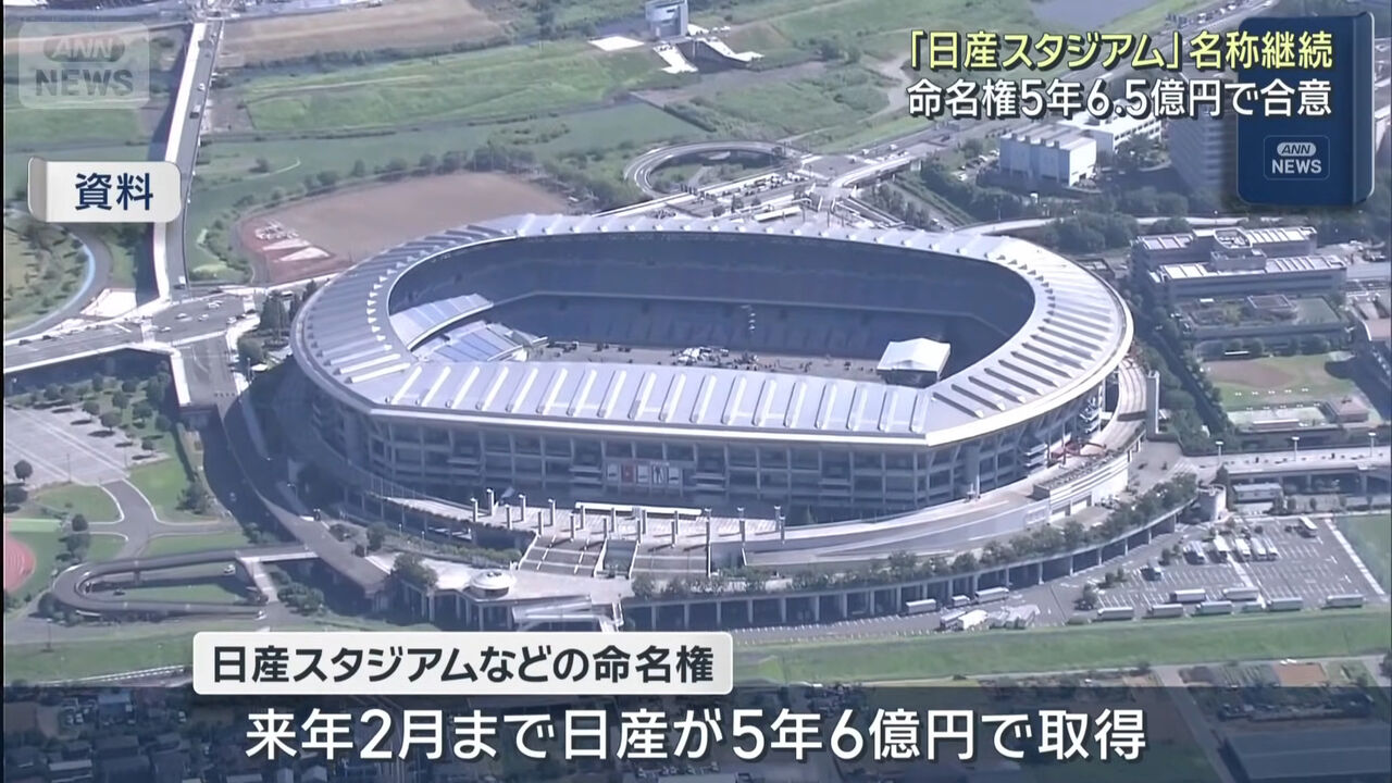 横浜市が保有する「日産スタジアム」やその周辺施設の命名権は、日産が来年2月まで5年間を6億円で取得しています。