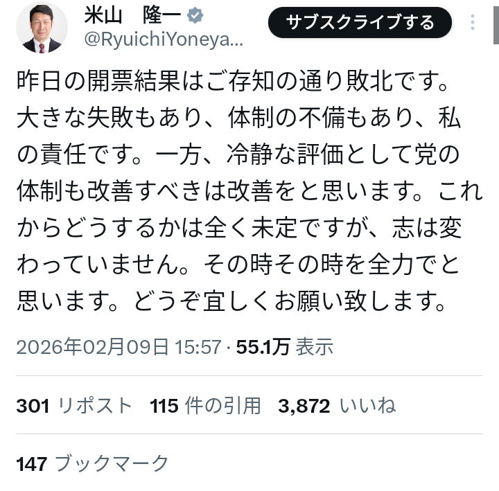 — 米山 隆一 (@RyuichiYoneyama) February 9, 2026