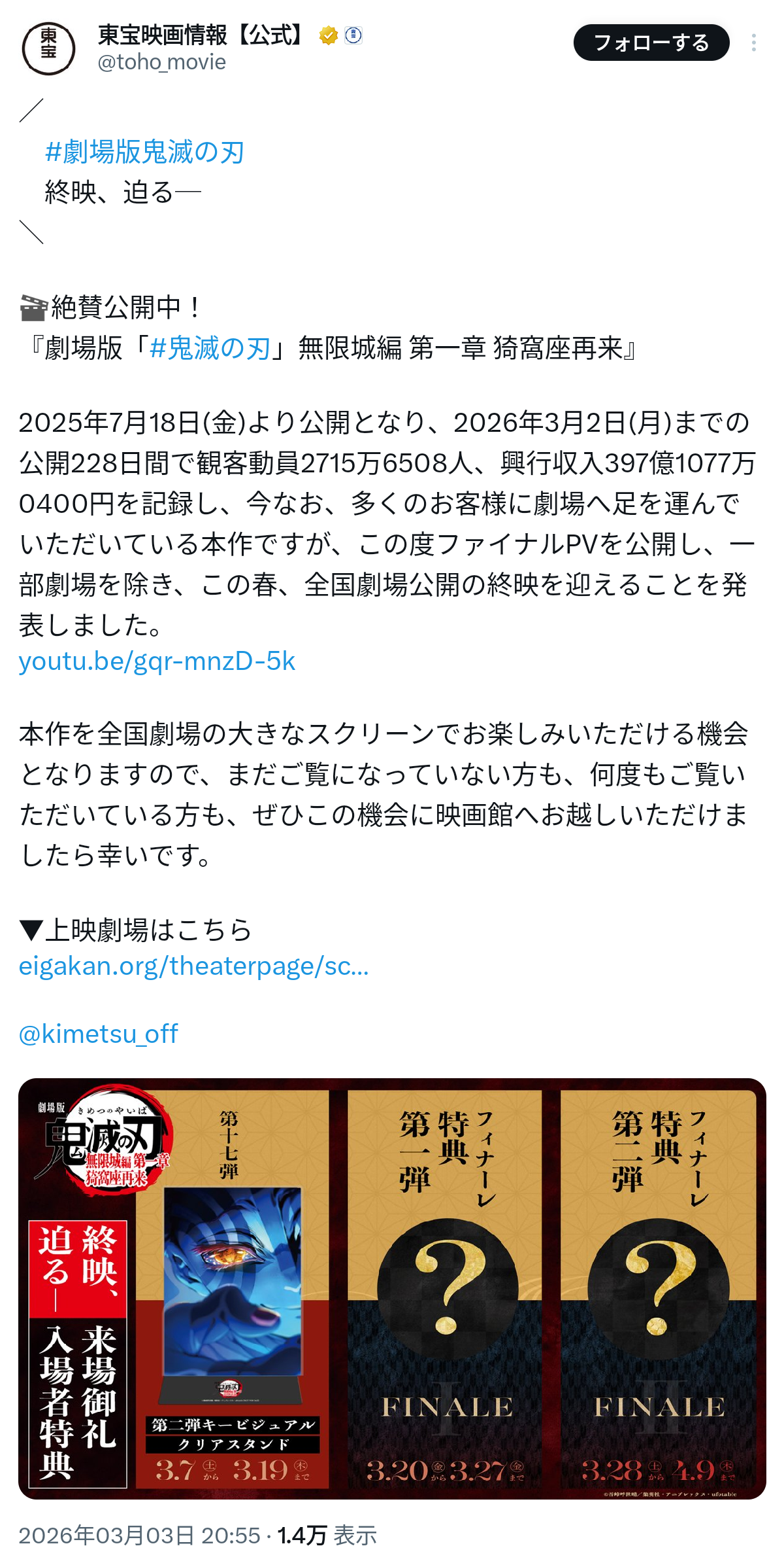4月までの加算+残った少数の上映分で、何とか夏までに400億円行くかな?