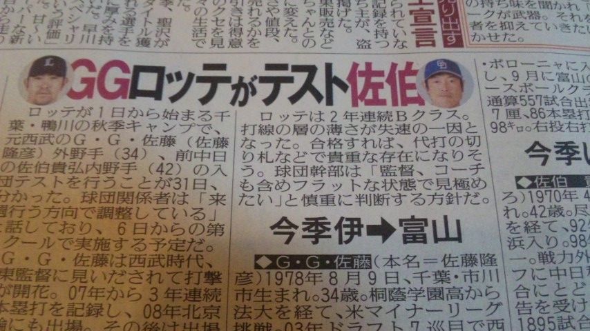 ロッテが1日から始まる千葉・鴨川の秋季キャンプで、元西武のG・G・佐藤(佐藤隆彦)外野手(34)、前中日の佐伯貴弘内野手(42)の入団テストを行うことが31日、分かった。球団関係者は「来週に行う方向で調整している」と話しており、6日からのキャンプ第2クールで実施する予定だ