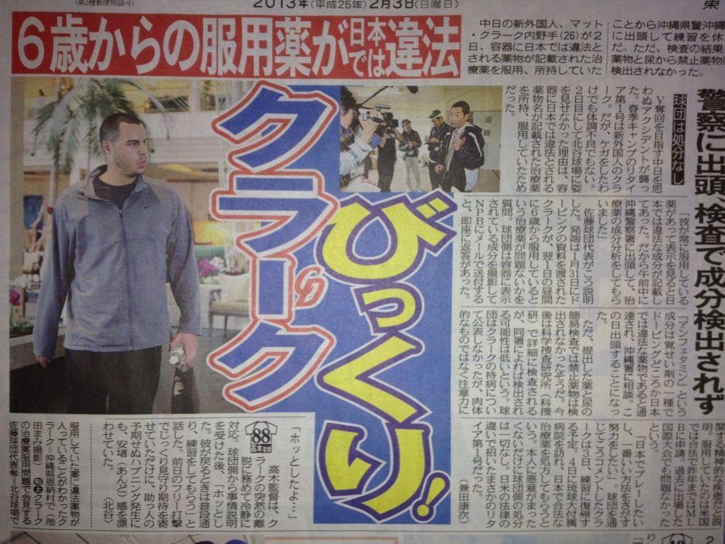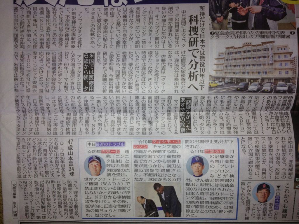 中日の新外国人、マット・クラーク内野手(26)が2日、持病により常用していた薬の成分に覚せい剤取締法の規制対象となるアンフェタミンが含まれている可能性があったため、沖縄県警沖縄署に出頭。簡易の尿検査と事情聴取を受けた。違法成分は検出されなかったが、事態を重く見た中日・佐藤良平球団代表(55)がキャンプ地の沖縄・北谷で緊急会見。今後、科学捜査研究所で薬剤と尿の詳しい検査が行われ、結果次第では退団にまで発展する可能性も否定できない。