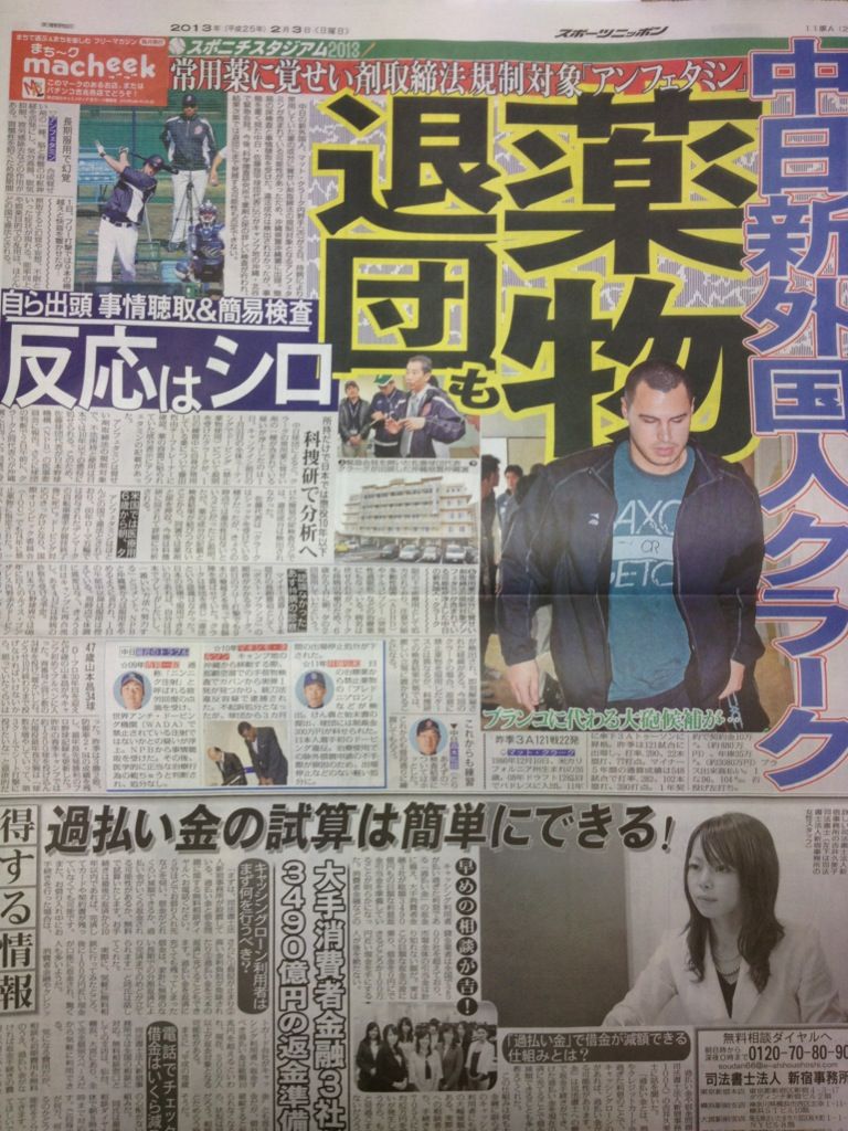 日本プロ野球界では08年に巨人のルイス・ゴンザレス内野手がドーピング検査でアンフェタミンが検出され、即刻解雇された経緯がある。