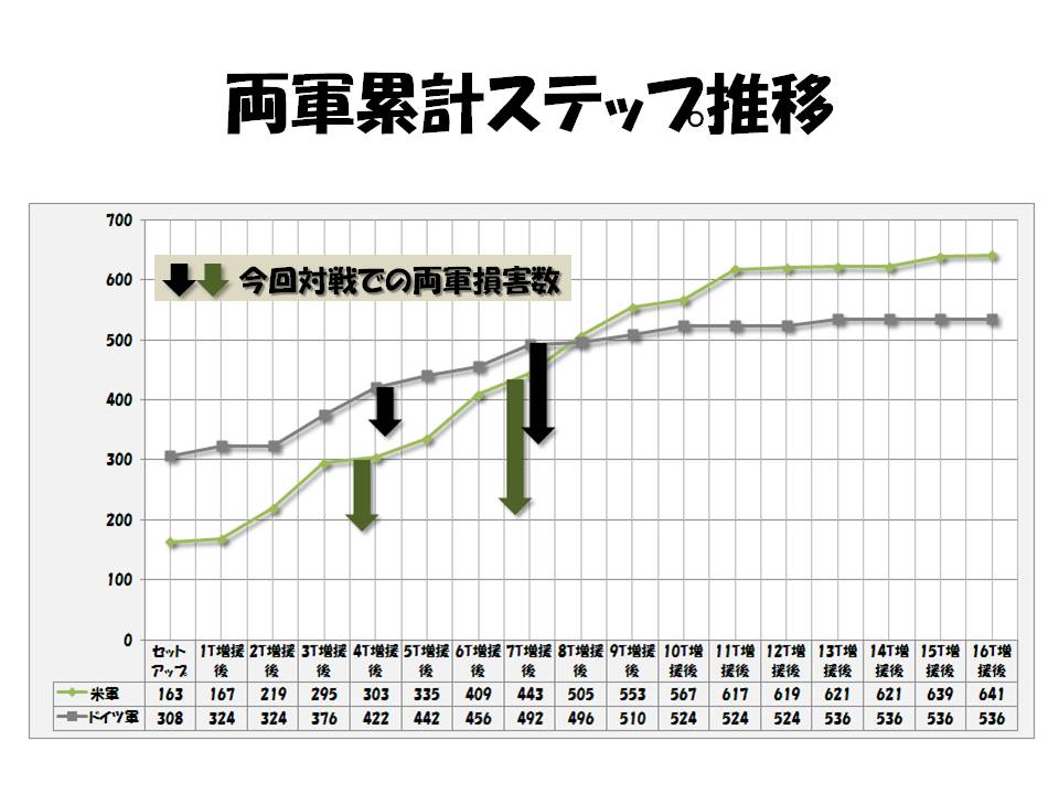 ¡¡¥í¥¹¥È¥Õ¤¬´ÙÍ¤ë¡£13VP(Îß·×83VP)¡£ÆÈ·³¤âÊäµë¤¬ÆÏ¤«¤Ê¤¤¤Î¤Ç¡¢Çɼê¤ÊÁ°¿Ê¤Ï¤Ç¤¤Ê¤¤¤¬¡¢Ë̤ÎÅ´Æ»Àþ¤È¥í¥¹¥È¥ÕÇØ¸å¤ÎÅ´Æ»Àþ¤¬ÀÚ¤é¤ì¤¿¤³¤È¤Ç¡¢¥½Ï¢·³¥«¥¦¥ó¥¿¡¼¥Õ¥§¥¤¥º¤Ç¤Û¤È¤ó¤É¤Î¥½Ï¢·³ÉôÂ⤬ÊäµëÉÔ¤ˤʤäƤ·¤Þ¤Ã¤¿¡£¥Þ¡¼¥«¡¼¤òÃÖ¤¯¤Î¤¬¤¢¤Þ¤ê¤Ë¤á¤ó¤É¤¯¤µ¤¤¤¿¤á¡¢Êäµë¤Î¤¢¤ë¥æ¥Ë¥Ã¥È¤Ë¥Þ¡¼¥«¡¼¤ò¾è¤»¤ë¡¢¤È¤¤¤¦ÆÃÊ̱¿ÍÑ¡©¡¡¤ò¹Ô¤¦¡£¡¡¥É¥ó²Ï¤òÅϲϤ·¤¿ÆÈ·³ÉôÂâ¤ÏÇö¤¤ÀïÀþ¤òÄ¥¤Ã¤Æ¥¹¥¿¡¼¥ê¥ó¥°¥é¡¼¥ÉÊýÌ̤ؿŤ·¤Æ¤¤¤ë¡£Êäµë´ðÃϤ¬±ä¤Ó¤Æ¤¯¤ë¤Î¤òÂԤäƤ¤¤ë¤«¤ó¤¸¤À¡£ÆÈ·³¤ÎÊâʼ1¥æ¥Ë¥Ã¥È¤¬¥â¥¹¥¯¥ïÊýÌÌ¤ØÆÍÇˤ·¤Æ¤¤¤Ã¤¿¤¿¤á¤µ¤é¤Ë1VP(Îß·×84VP)¡£