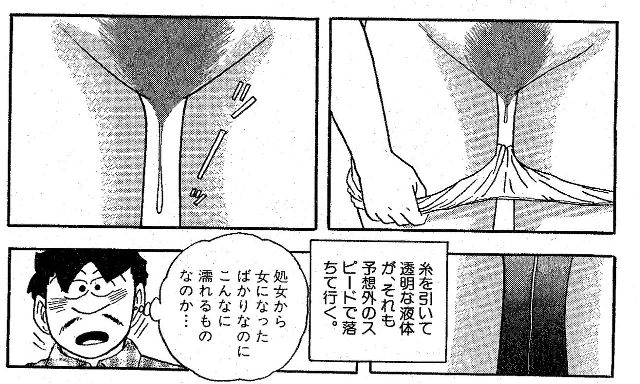 パンティを膝上まで降ろした時、ヘアの下部から、透明の液体が、糸を引いて落ちていく。