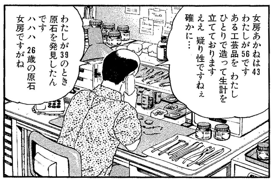 「女房あかねは43、わたしが56です。ある工芸品を、わたし一人で造って生計を立てております。ええ、凝り性ですねぇ、確かに・・・」