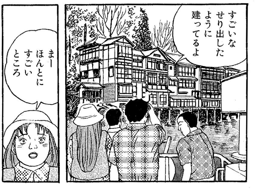 湖岸にせり出した、圧倒されるほど大きな三階建て木造建築の横に長く連なる旅館が迫ってきた。