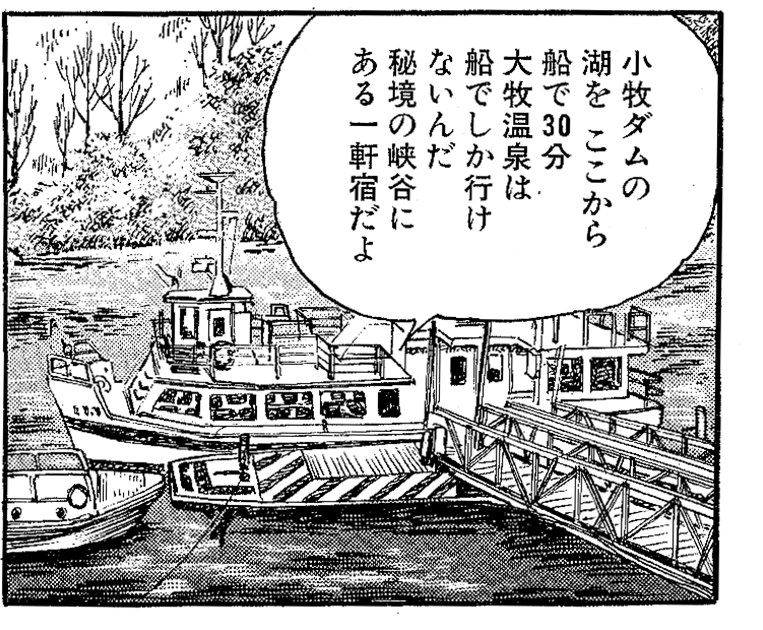「小牧ダムの湖を、ここから船で30分。大牧温泉は船でしか行けないんだ。秘湯の峡谷にある一軒宿だよ」