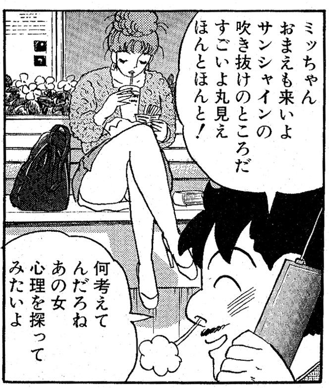 「ミッちゃん、おまえも来いよ、サンシャインの吹き抜けのところだ。すごいよ、(太ももが)丸見え。ほんと!」