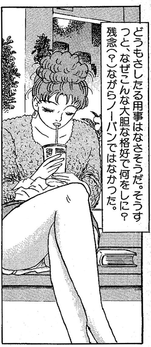 ワシの隣で、つまり、彼女の対面で新聞を読むフリして、ときどき彼女の剥き出しの脚を見ている。