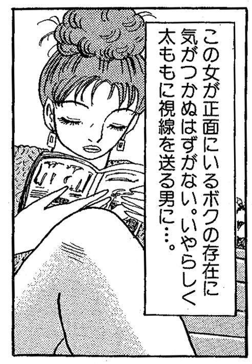 この女が正面にいるボクの存在に気がつかぬはずがない。いやらしく太ももに視線を送る男に・・・・。