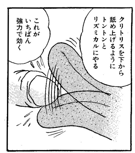 その時の舐め方はクリを剥いて下から上に舐め上げるようにトントントンとリズミカルに高速舐め。