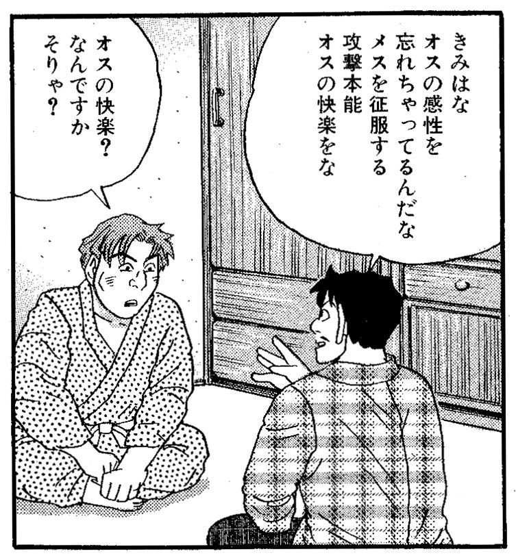 「きみはな、オスの感性を忘れちゃってるんだな。メスを征服する攻撃本能、オスの快楽をな」