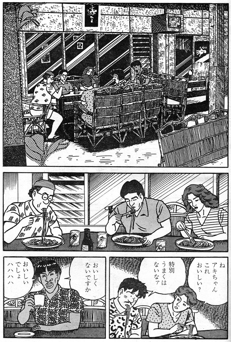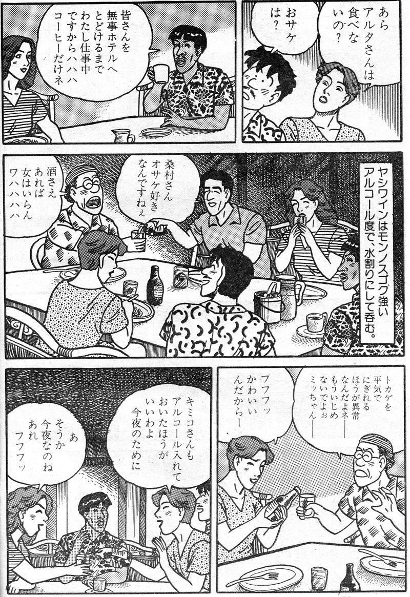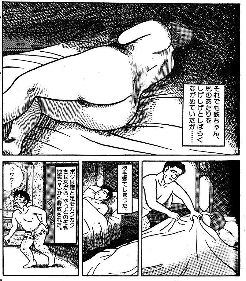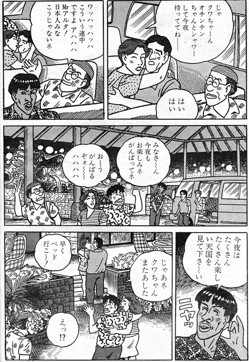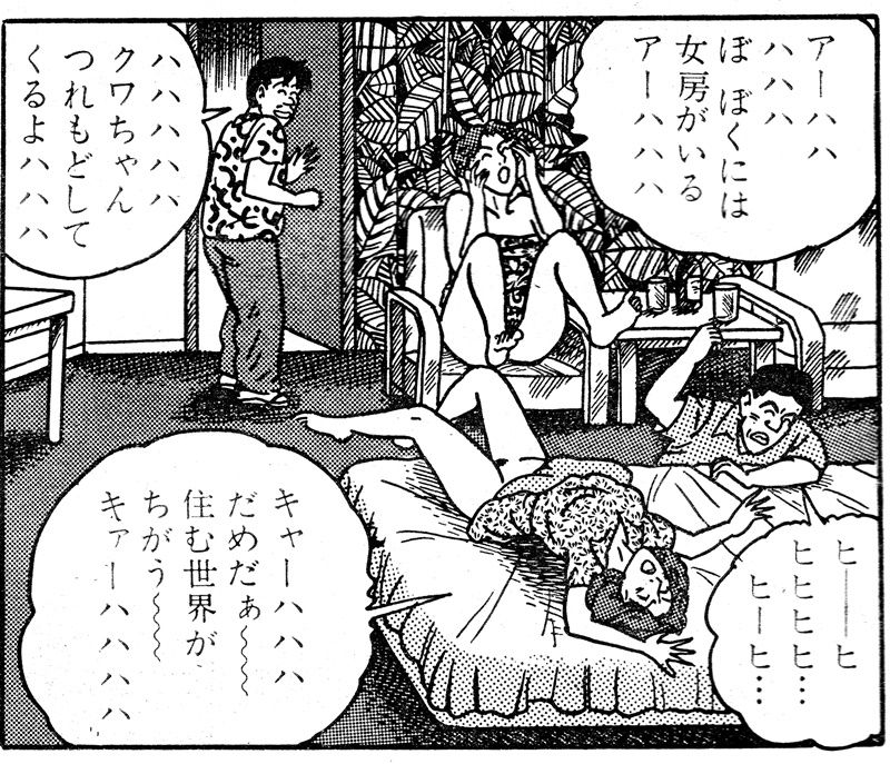 バリ更紗を巻いただけのトップレスミッちゃんと下半身丸出しのパジャマ姿のキミちゃん、すぐにクワちゃんの服を脱がしにかかる。