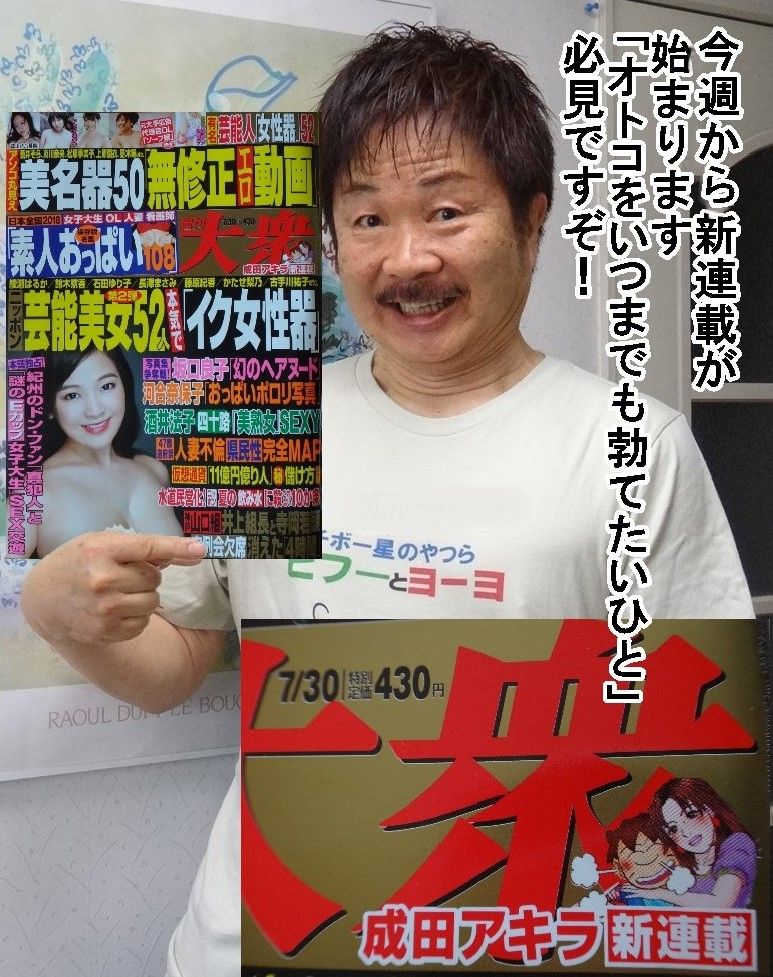 今週、14日土曜日発売の週刊大衆から、2000人斬り、成田アキラの「死んでもSEX講座」が始まります。元々生まれ育った週刊大衆に帰ってきました。73歳のワシ、まだまだナニも現役、オンナに向かう性欲も衰え知らず。読者諸兄の皆さまにヤラシイ性気を振りまいて行こうかと思っております。よろしくお願いいたします。
