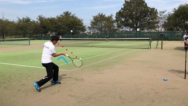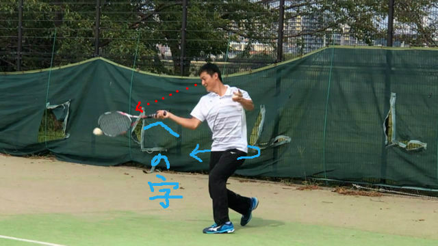 ポイントはラケットと前腕がひらがなの「へ」の字