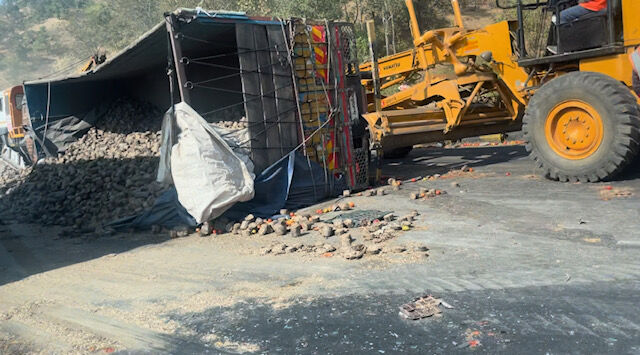 反対車線からは大型ダンプ・・