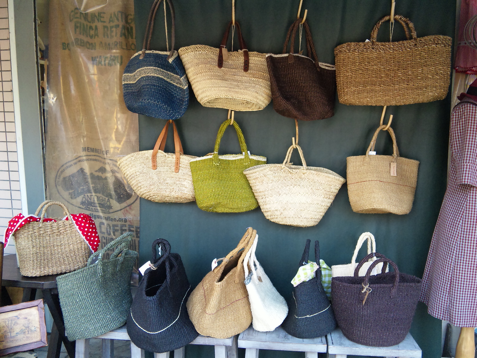 かごも揃いました〜サイザルバック新作、いつもの可愛い丸い型の更に可愛いミニタイプ、楕円形でふちにラインが入ったタイプ、ほぼ全種類今ならあります〜夏には品薄になります、人気商品です!