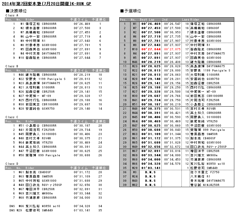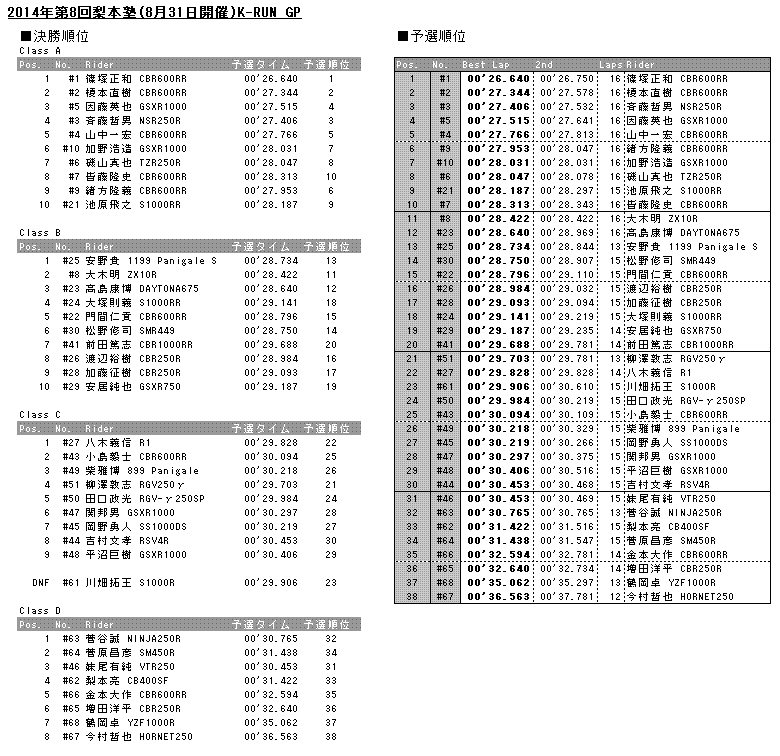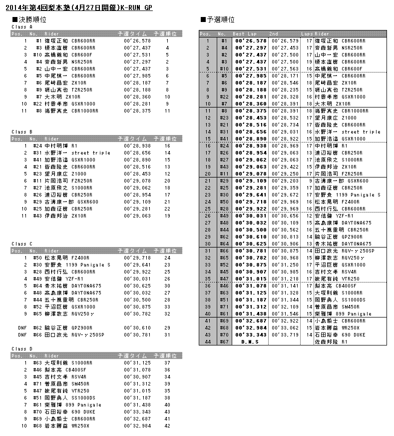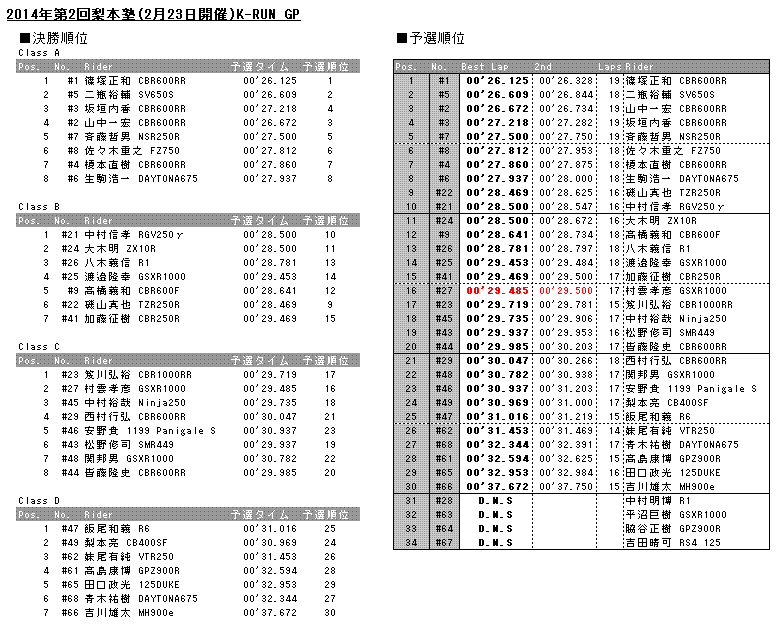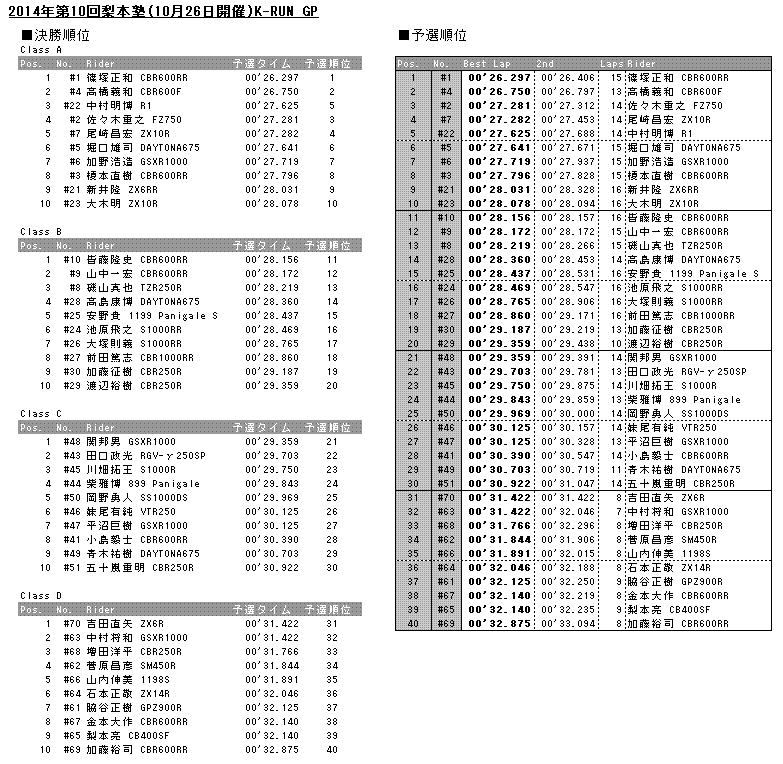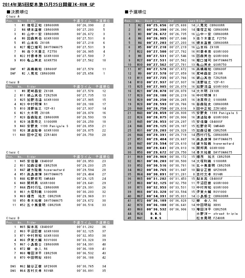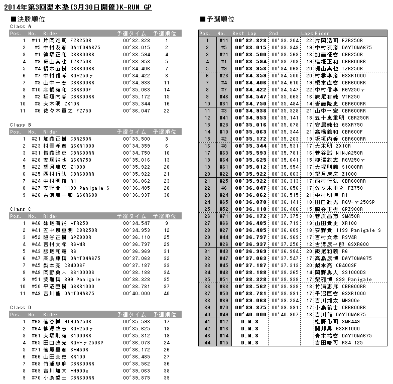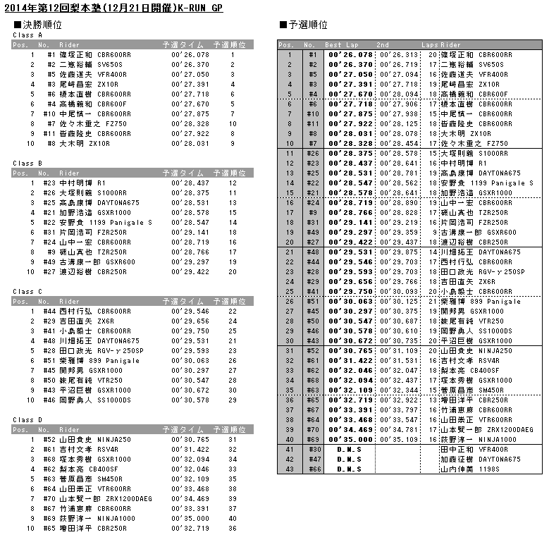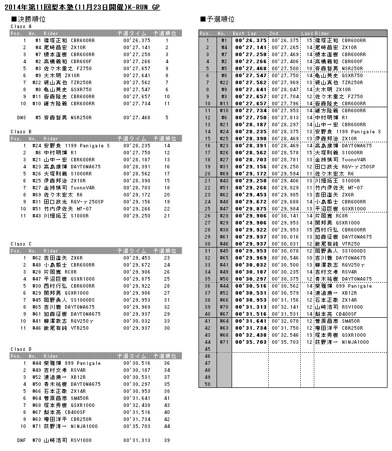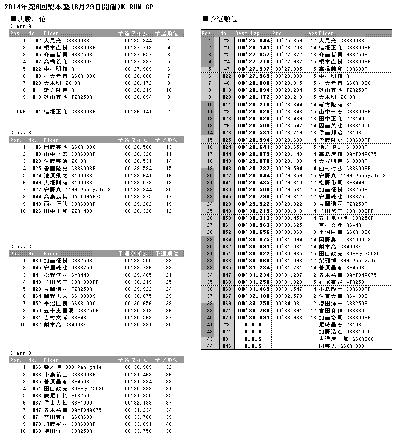 ※ コースコンディション不良により、K-RUN-GPは中止。予選順位はタイム順とし、決勝順位に関しては午前走行当該クラス内における予選結果順とした。