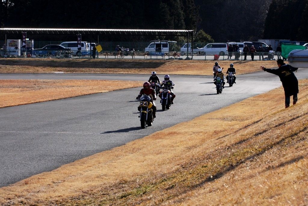 しかし、スタート直後の1コーナーで早くもアクシデント発生。瀧崎NSR50がなんとチェーン外れにより脱落。普段レーススタートを行っていない多くのアマチュアライダーは、このようなトラブルに出遭うケースも少なくない。チェーン、及びアクスルシャフト系の管理はしっかり行いたい。