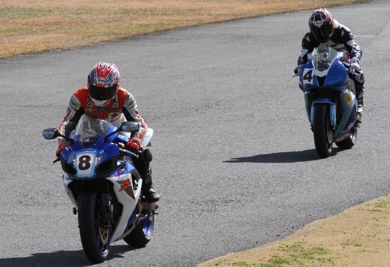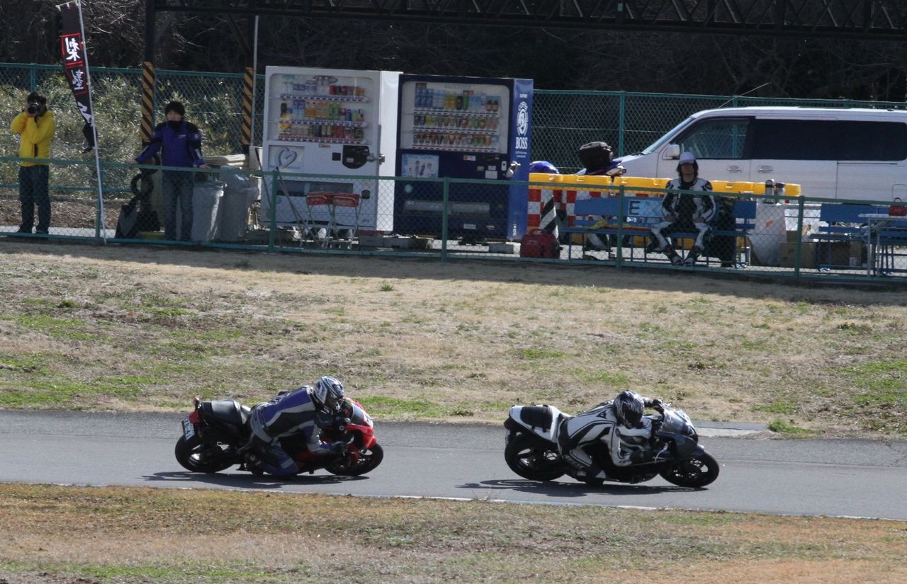 ラップタイム的には樽井が勝るが、体力と排気量で勝る八木がこれをリード、さらに豊山も隙を狙っている。