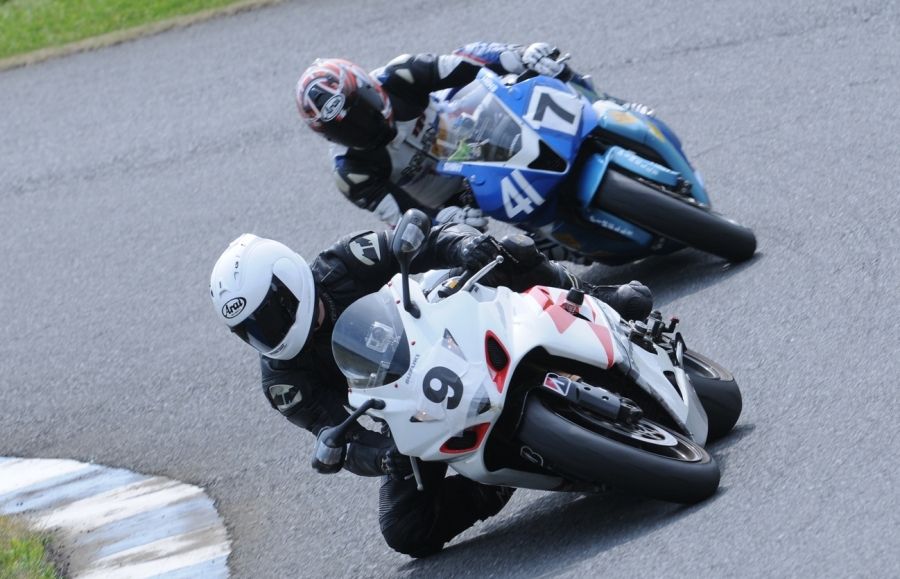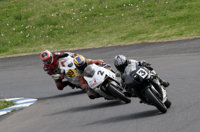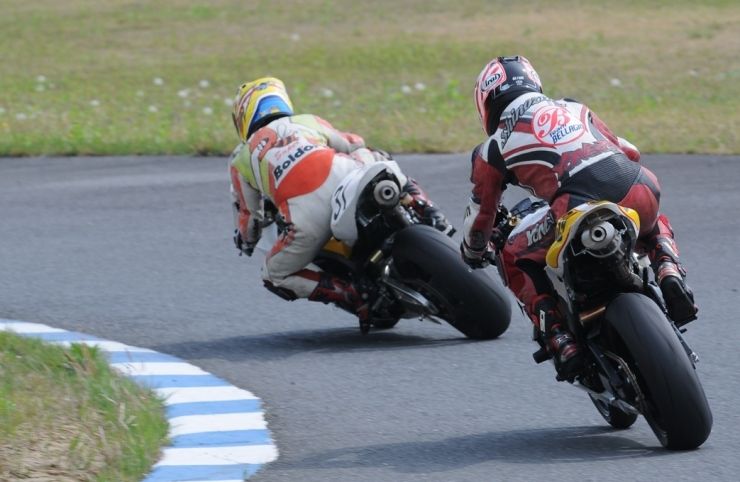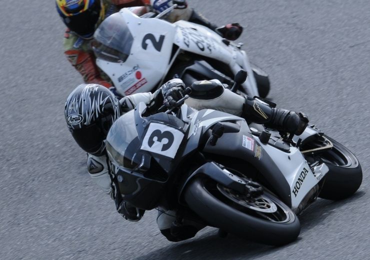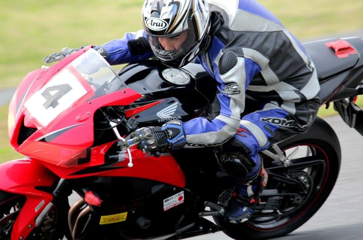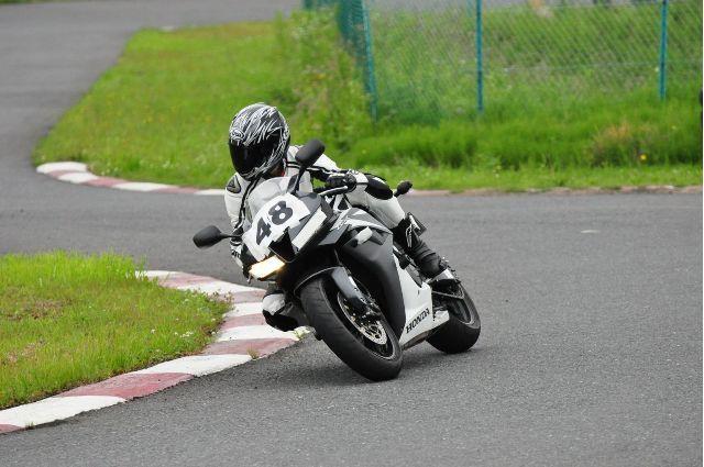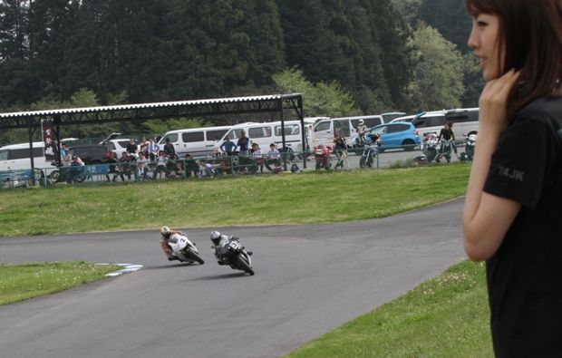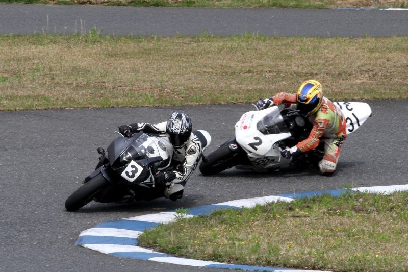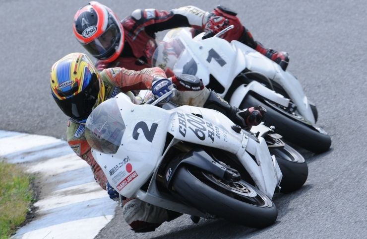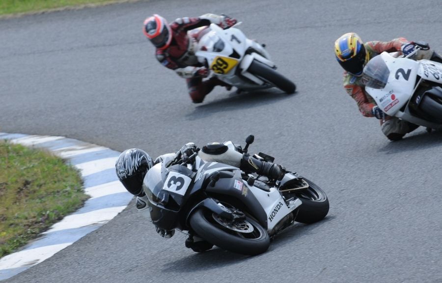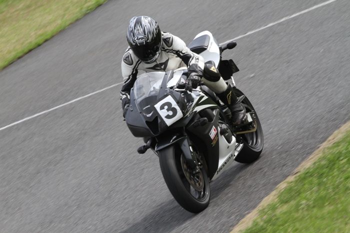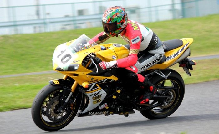 唯一の国内仕様、さらにモデファイされていないCBR600RRを駆る渡辺も力走している。最大出力は実測後輪で70PS前後、すなわちこのクラスを走る他のモデルに対し、最低でも30PS以上、後ろの柴田R1とはほとんど2倍ほどのパワー差があるが、それを気合で埋める渡邉。KDC製タンクパットの装着で着座位置も安定したようだ。