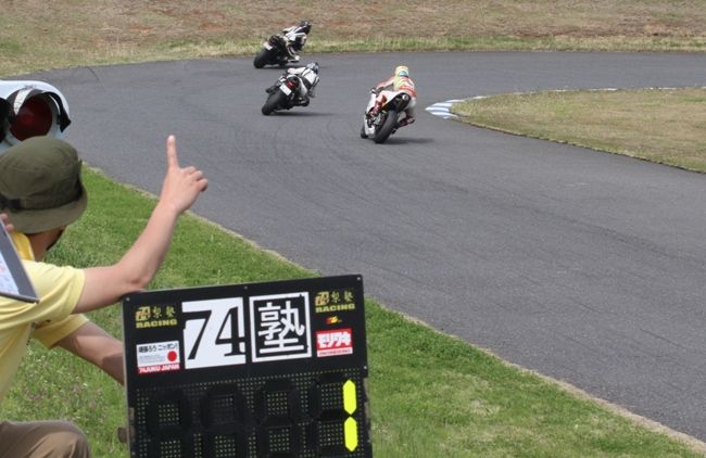 午後2時過ぎ、いよいよ決勝レースが始まる。恒例塾長のグッドラックサインからフリー走行へ。