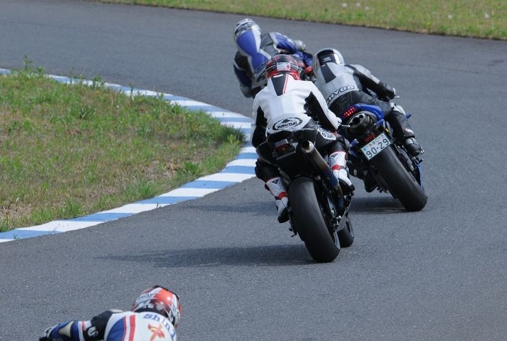 その後方にデイトナ中村、GSXR1000の米山と続き、渡邉GSXR1000は外側に弾かれる格好。さらにその後ろ、8番手に中尾。