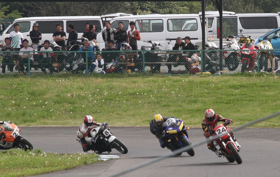 外側から八木が被せていく中、内側から山本がインを奪おうとする。その後方にはスタートで前に出た佐々木(重)FZが3番手に浮上。外側には柴田(巳)ウルフ250。