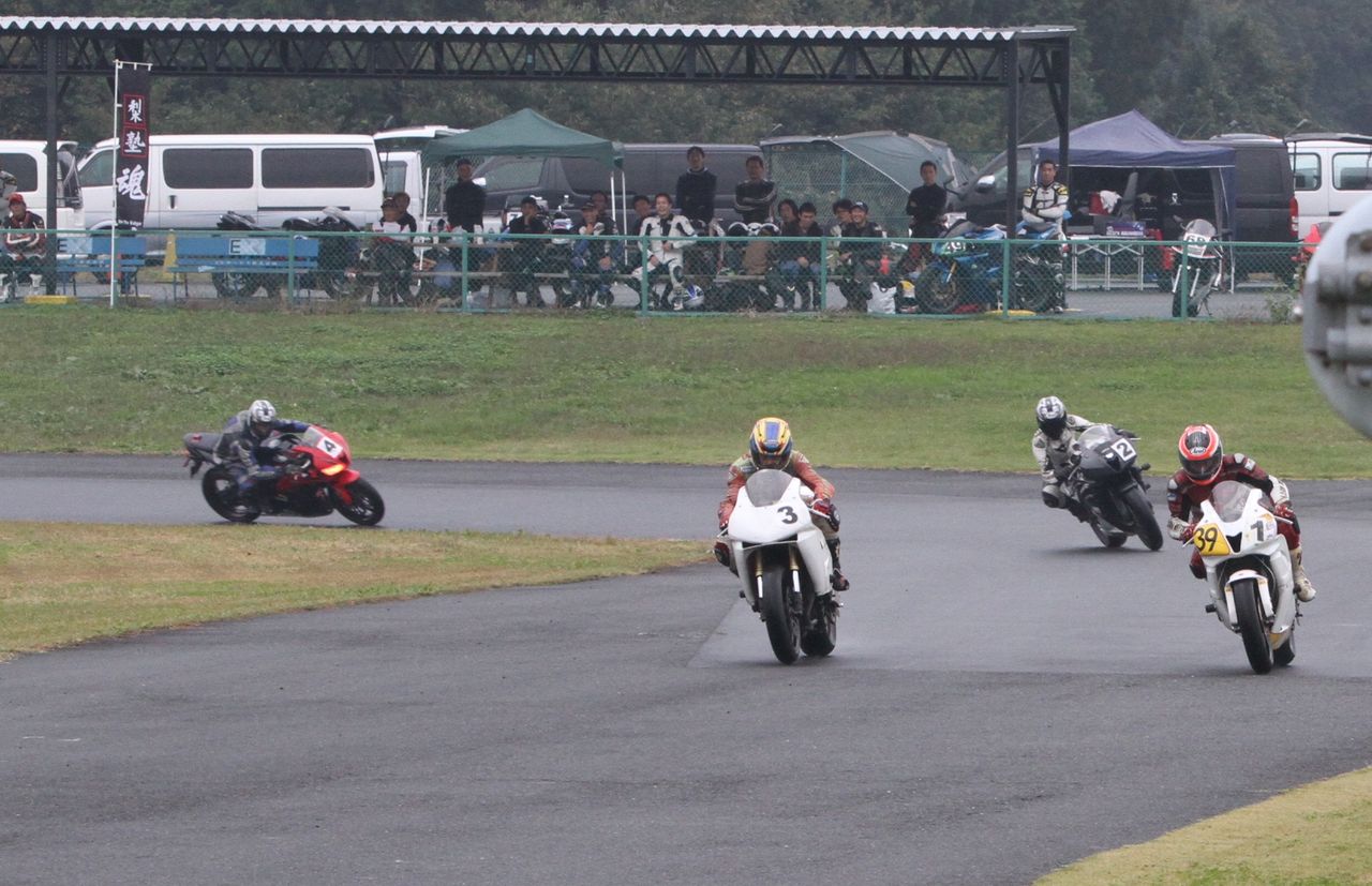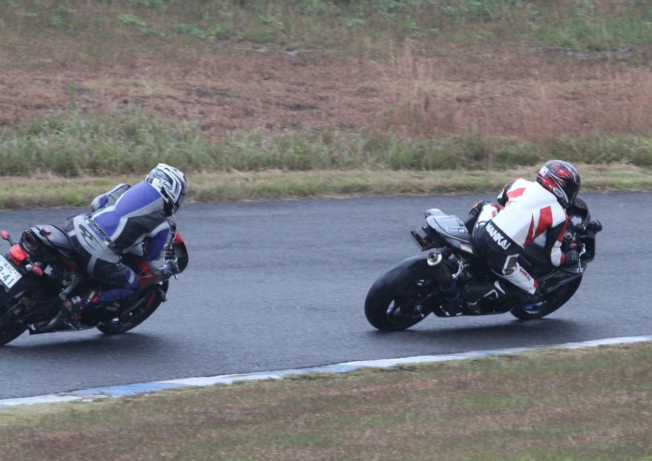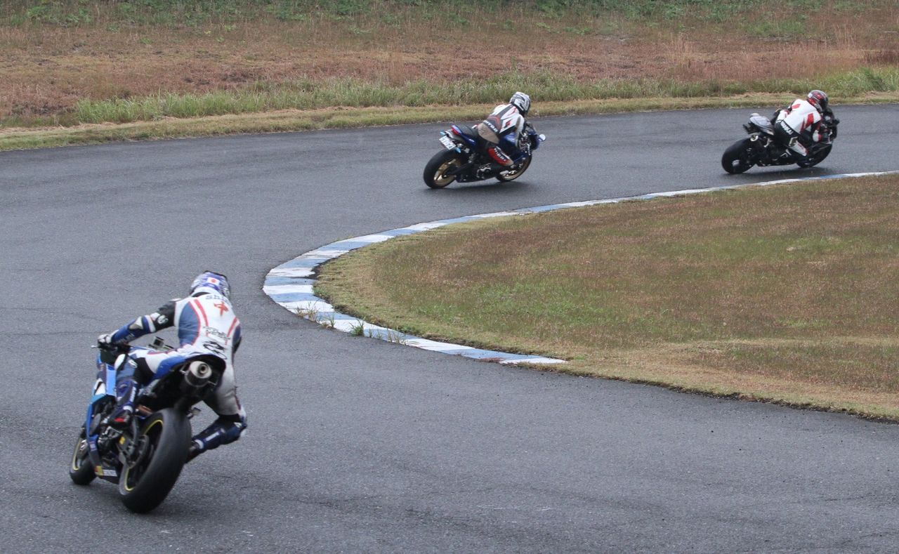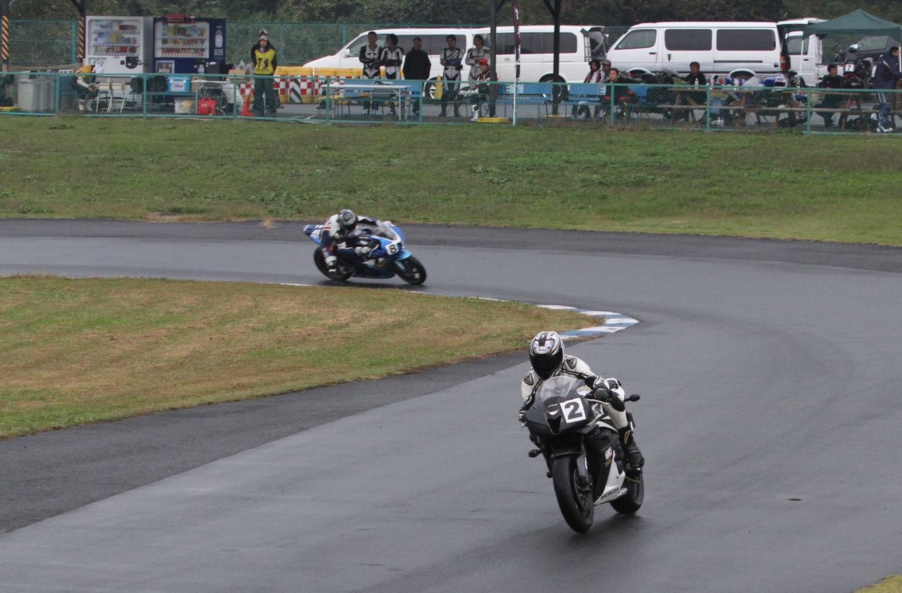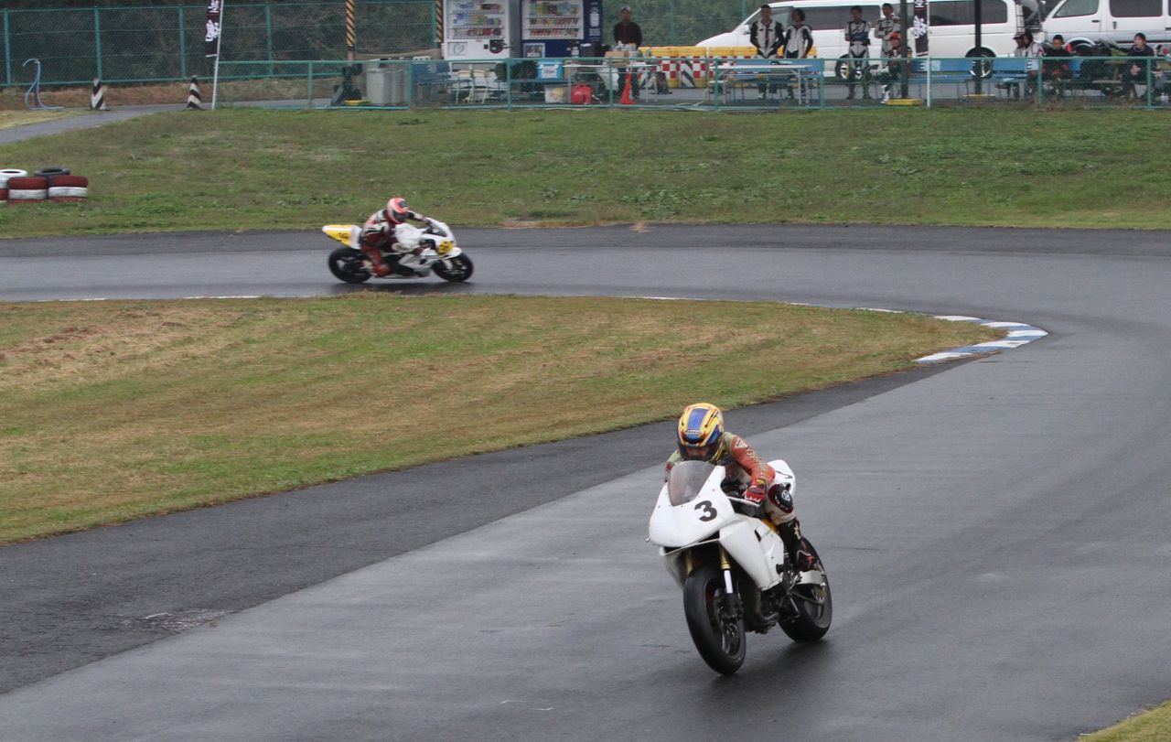 そして4番手の坂垣内まで全選手がディアブロコルサのSC1、及びSC2の組み合わせである。写真ではもうひとつ分かりにくいが、路面は飛沫が上がらない程度の、フルウェット状態だ。