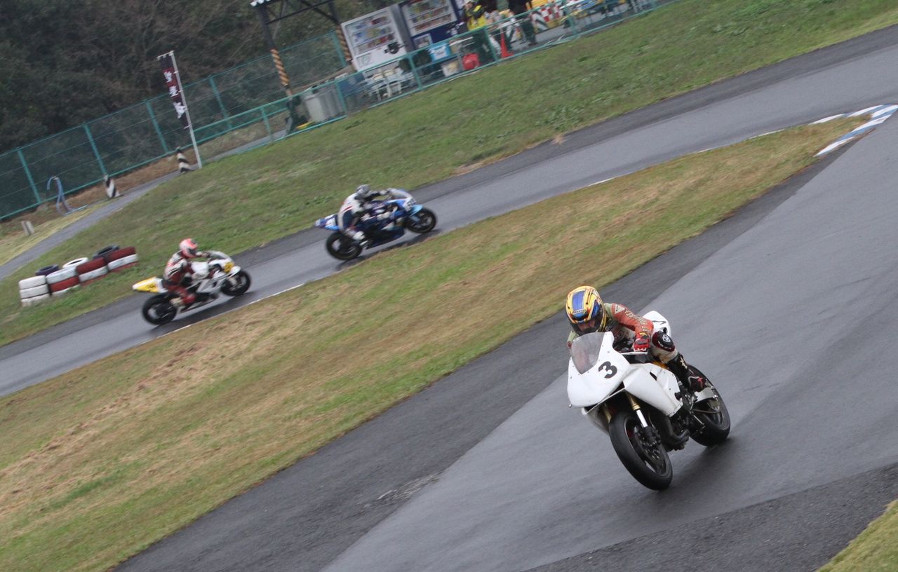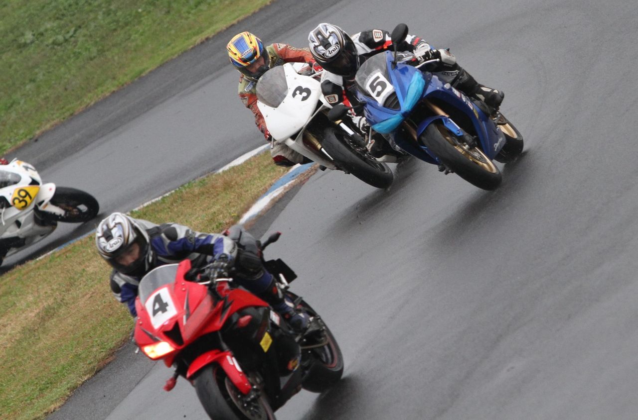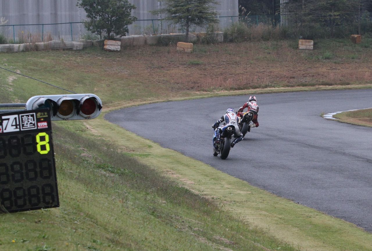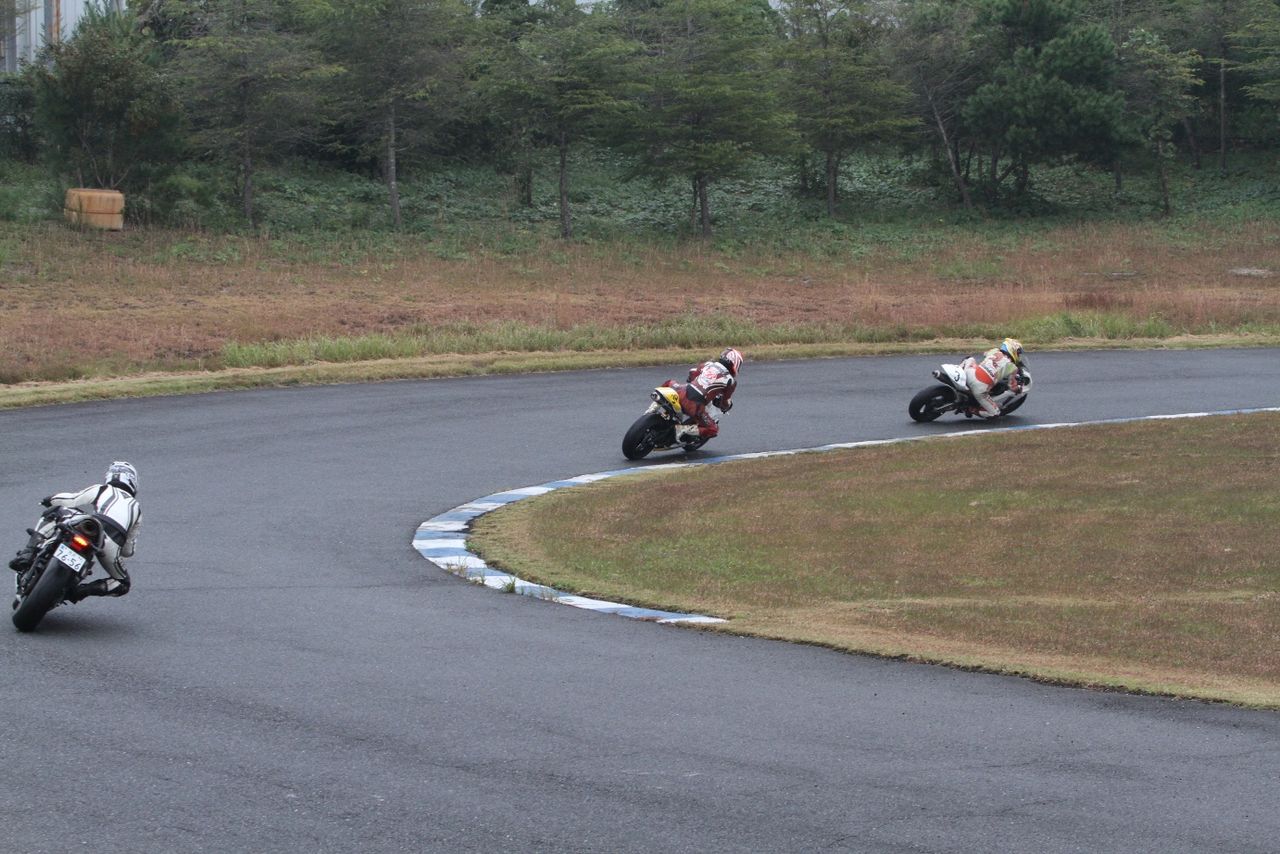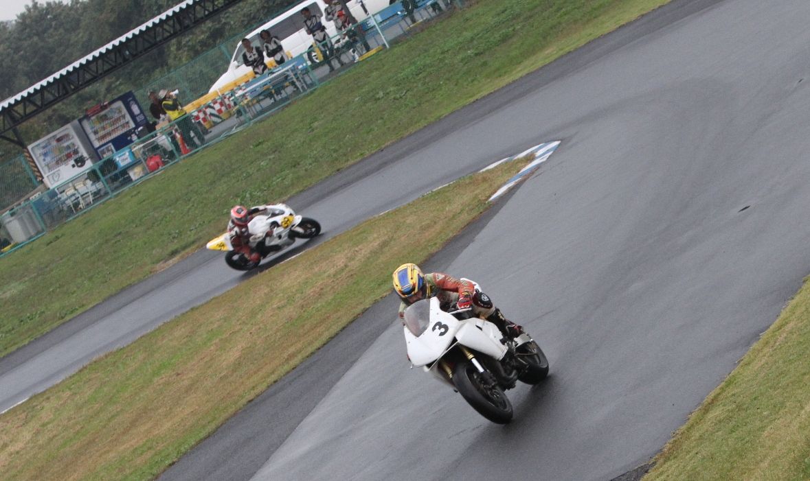 そして4番手の坂垣内まで全選手がディアブロコルサのSC1、及びSC2の組み合わせである。写真ではもうひとつ分かりにくいが、路面は飛沫が上がらない程度の、フルウェット状態だ。