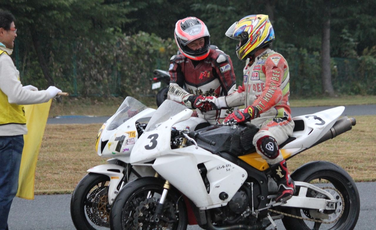 レース終了後、互いを称えあう人見と篠塚。二人の活躍が梨本塾のこの2シーズンを牽引してきたといっていいだろう。