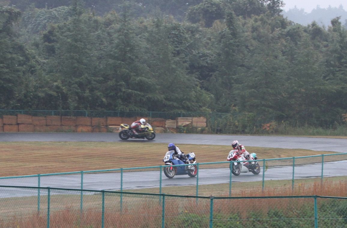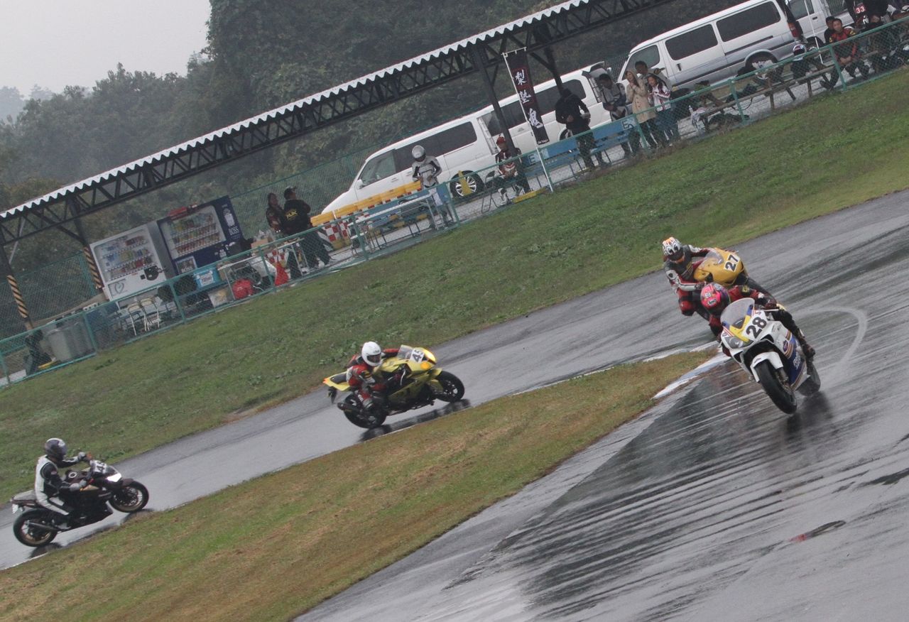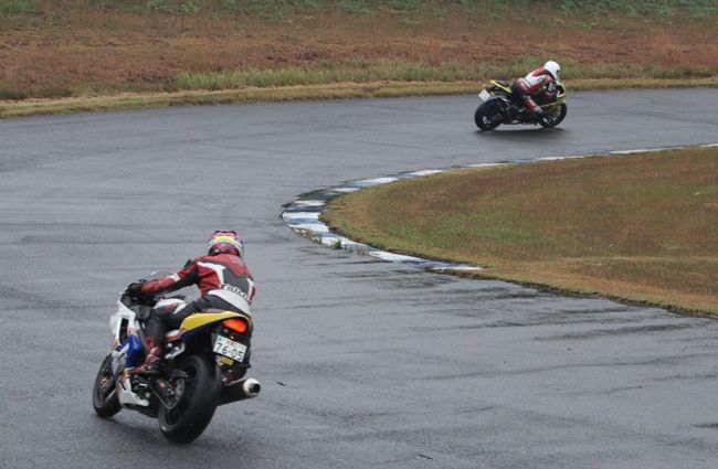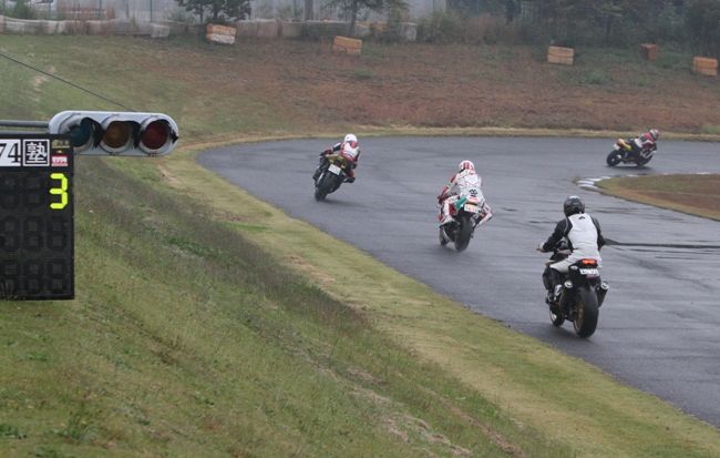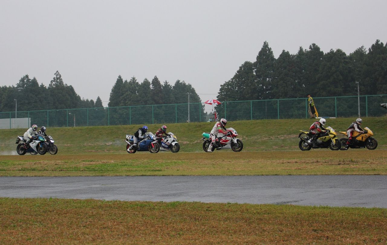 Bクラスのレースではかなりの土砂降りとなったが、その後小康状態となり、そのままCクラスのレースへと突入。グリッドには2台のSS1000、そして2スト250が並んだ。右からポールの笈川CBR1000RR、池原S1000RR、そして磯山TZRの順である。なお、このCクラスでも予選6番手の松本FZ400Rが諸事情により出走前リタイヤとなった。
