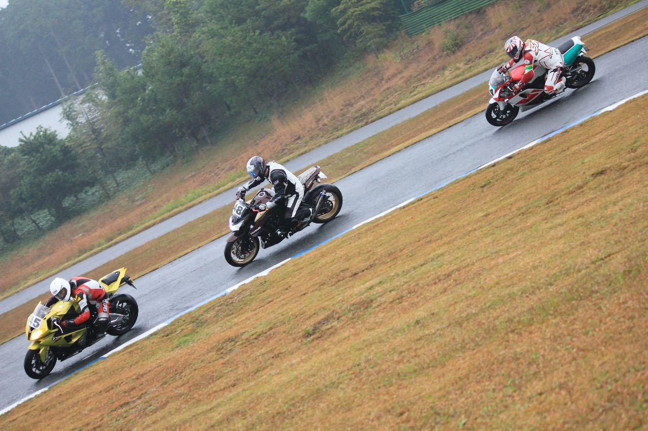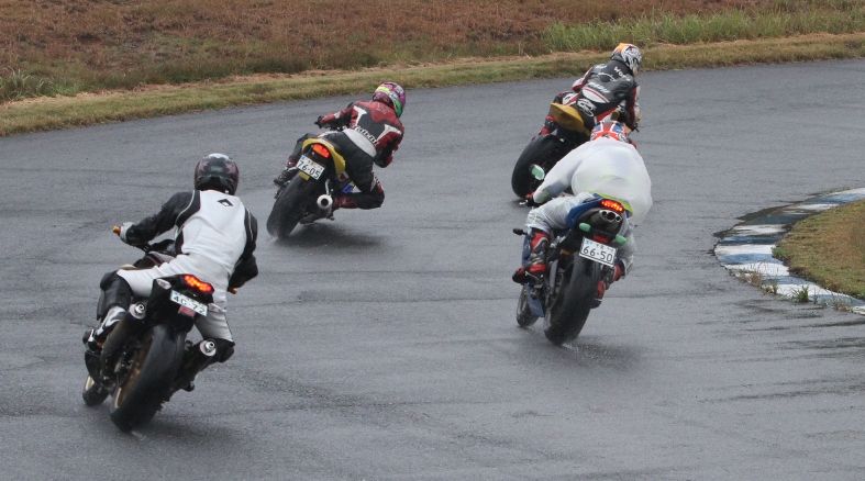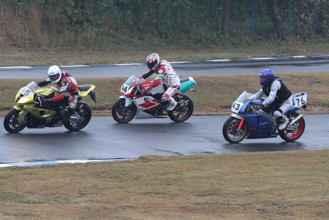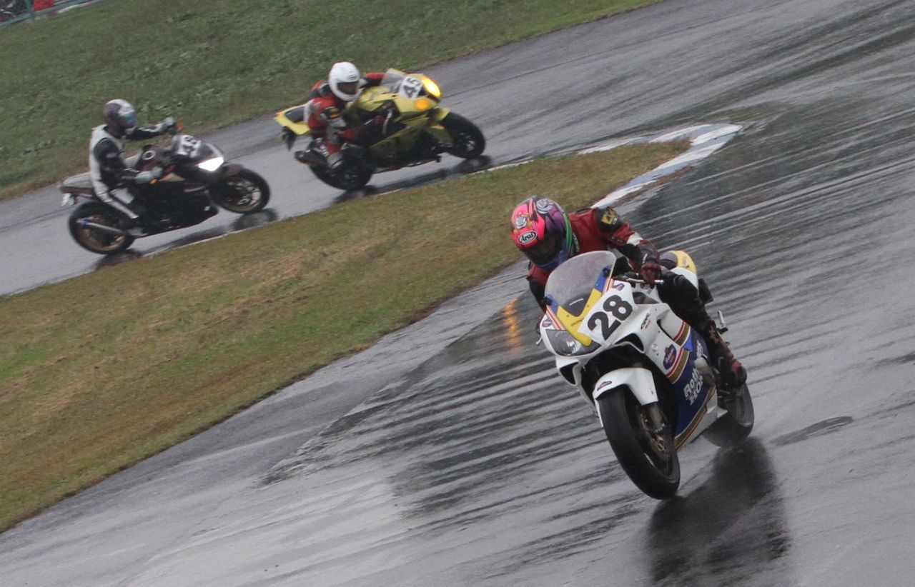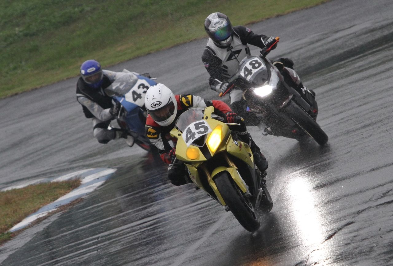 Bクラスのレースではかなりの土砂降りとなったが、その後小康状態となり、そのままCクラスのレースへと突入。グリッドには2台のSS1000、そして2スト250が並んだ。右からポールの笈川CBR1000RR、池原S1000RR、そして磯山TZRの順である。なお、このCクラスでも予選6番手の松本FZ400Rが諸事情により出走前リタイヤとなった。