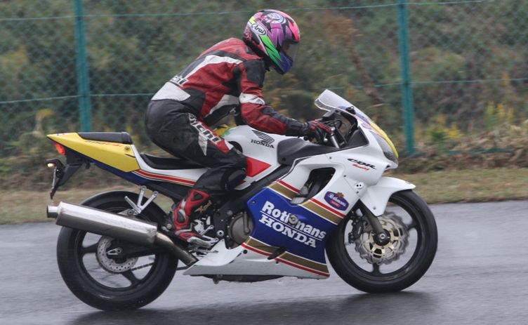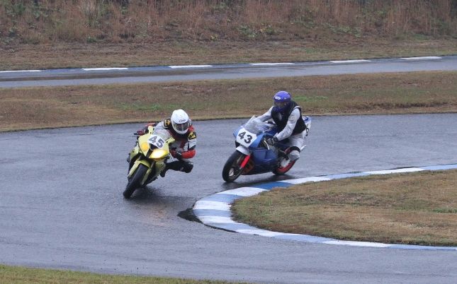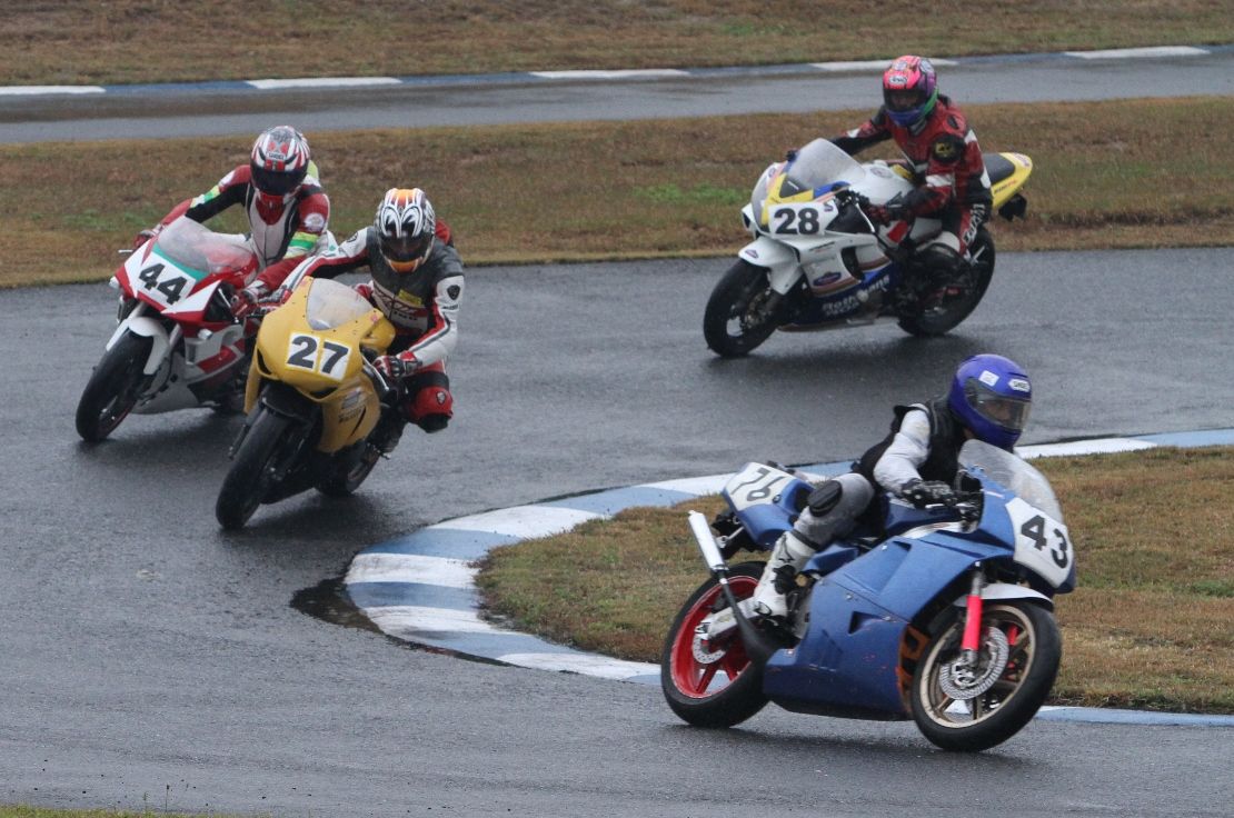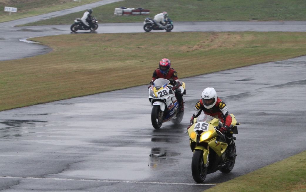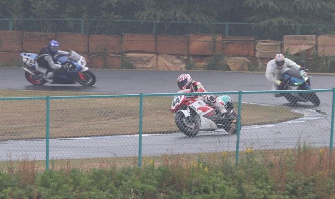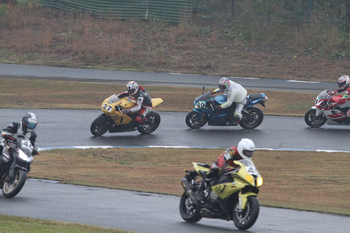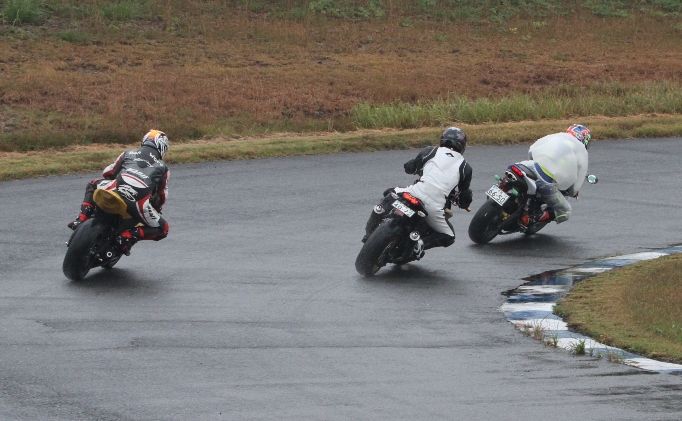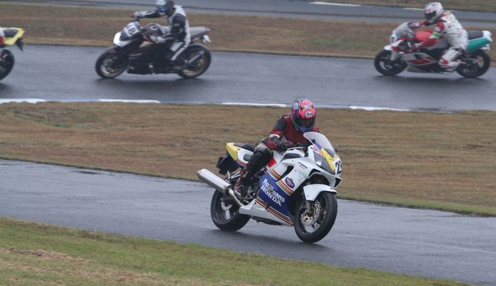 Bクラスのレースではかなりの土砂降りとなったが、その後小康状態となり、そのままCクラスのレースへと突入。グリッドには2台のSS1000、そして2スト250が並んだ。右からポールの笈川CBR1000RR、池原S1000RR、そして磯山TZRの順である。なお、このCクラスでも予選6番手の松本FZ400Rが諸事情により出走前リタイヤとなった。