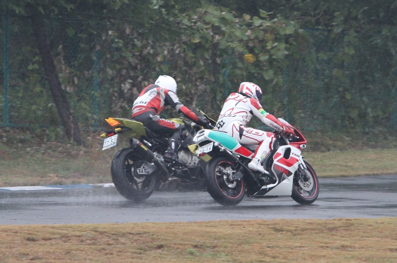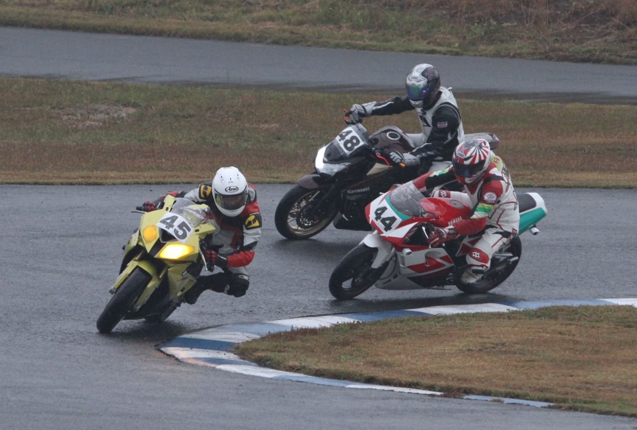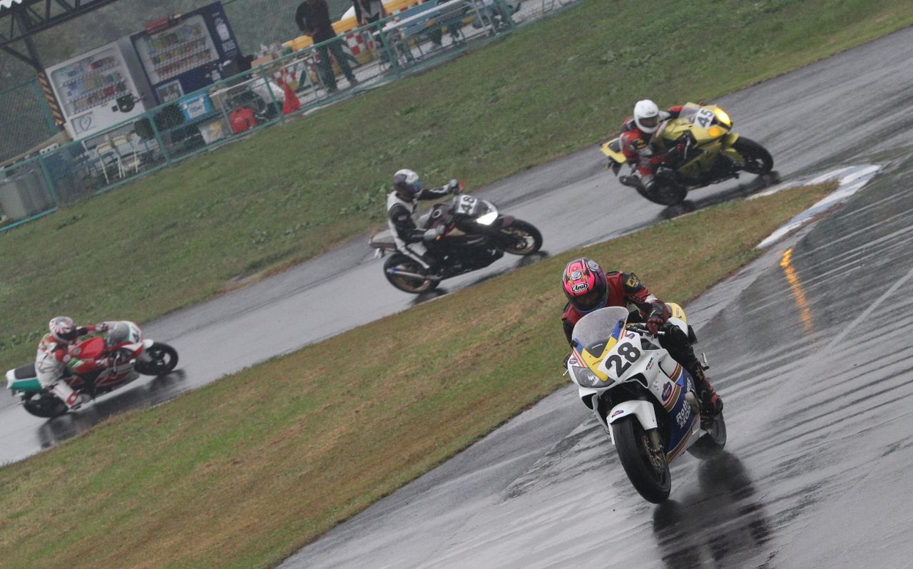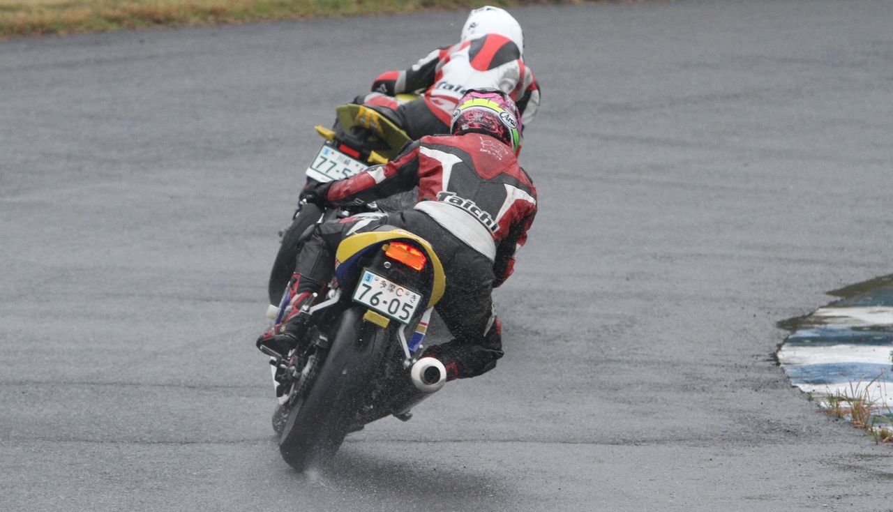 帝王コーナー進入で前に出て、2番手へ。一方池原は1コーナーで2つもポジションを落としてしまった。さすがのS1000RRも、雨の中では90年代を代表する2台の2サイクルマシンを前に成す術なしか。