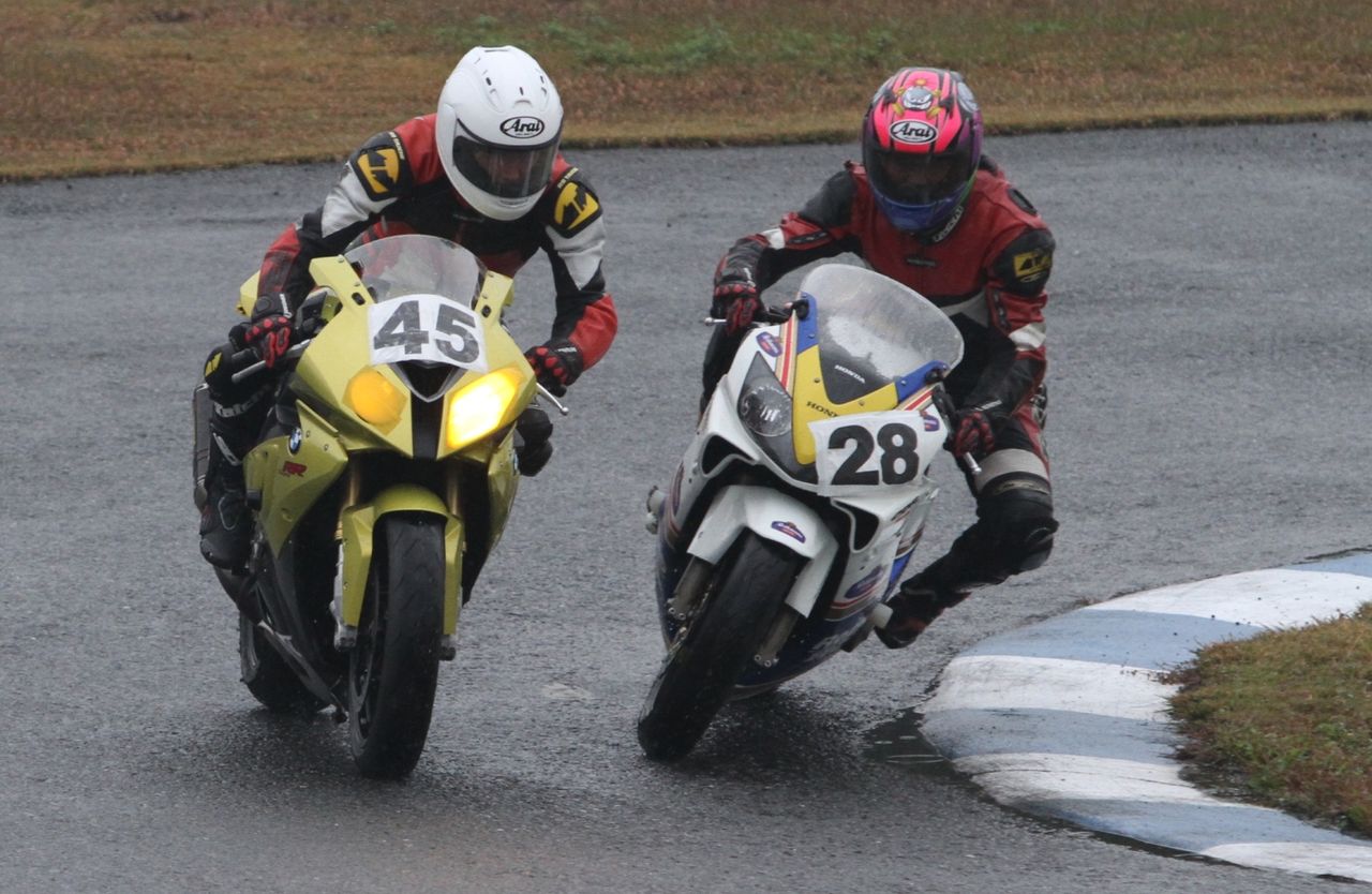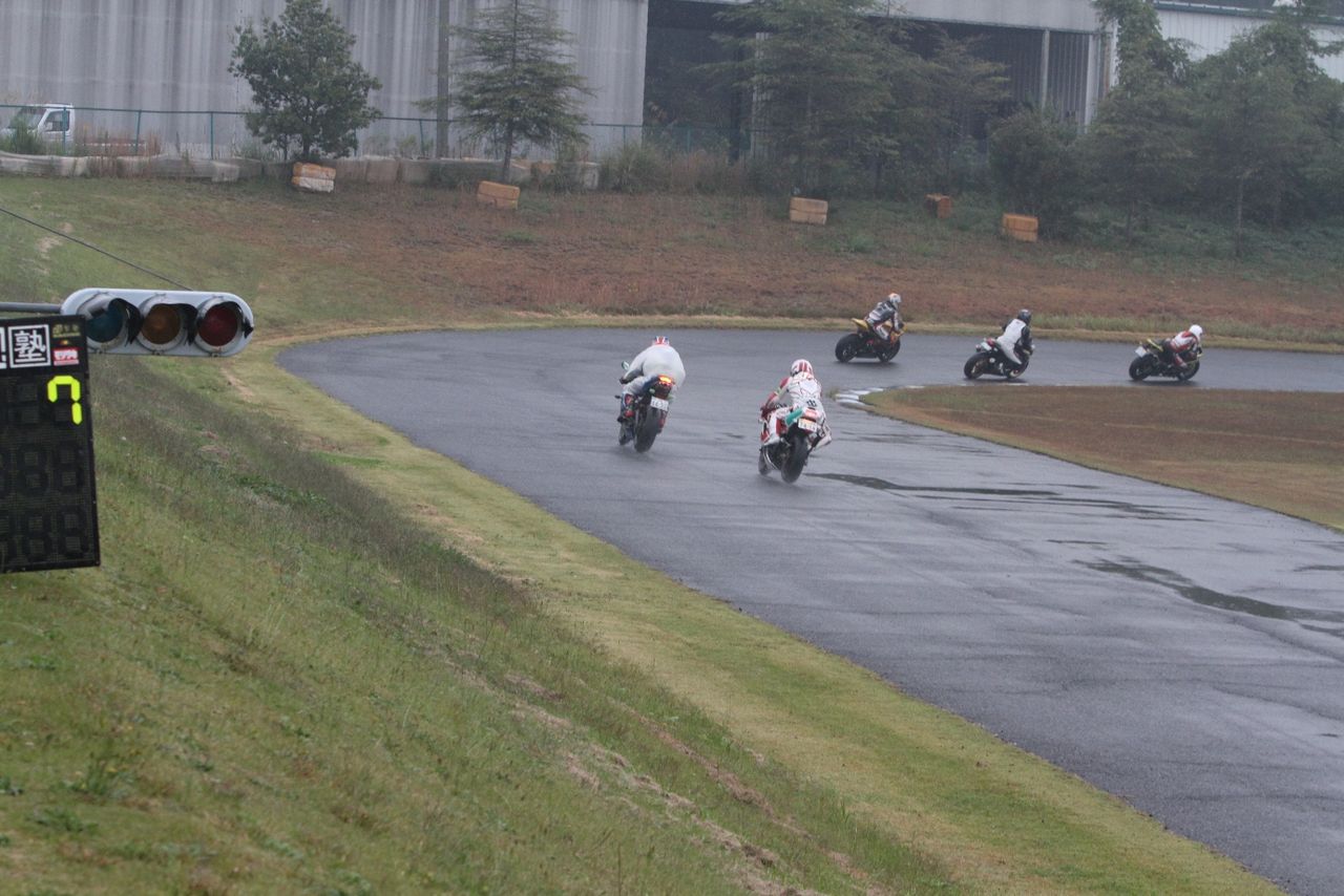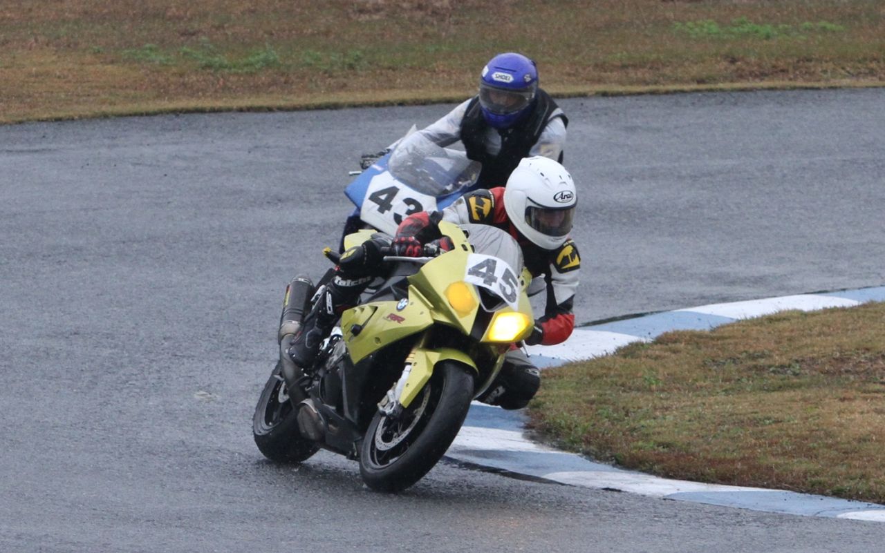 帝王コーナー進入で前に出て、2番手へ。一方池原は1コーナーで2つもポジションを落としてしまった。さすがのS1000RRも、雨の中では90年代を代表する2台の2サイクルマシンを前に成す術なしか。