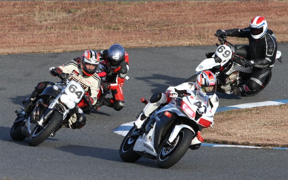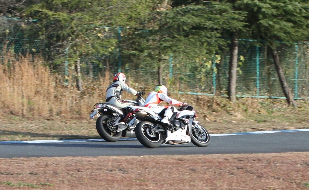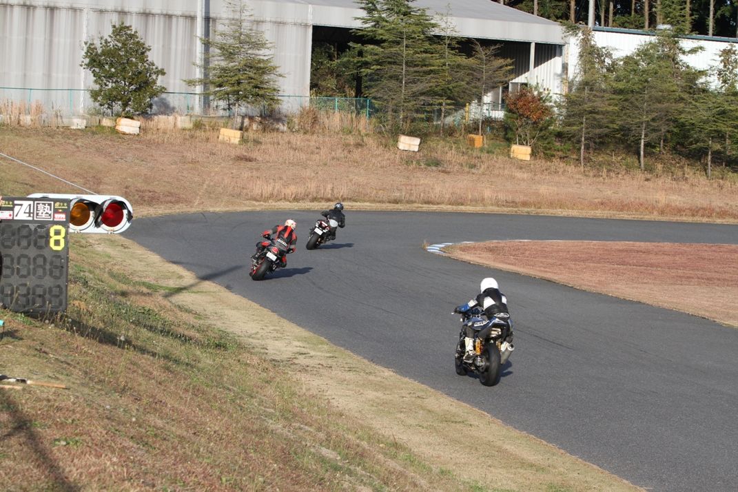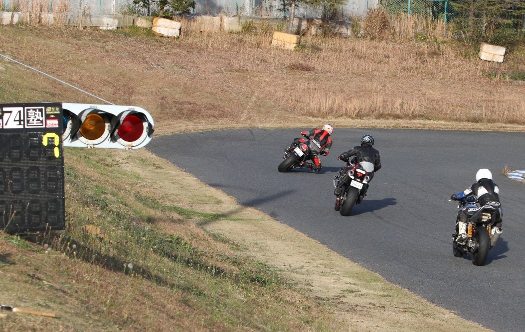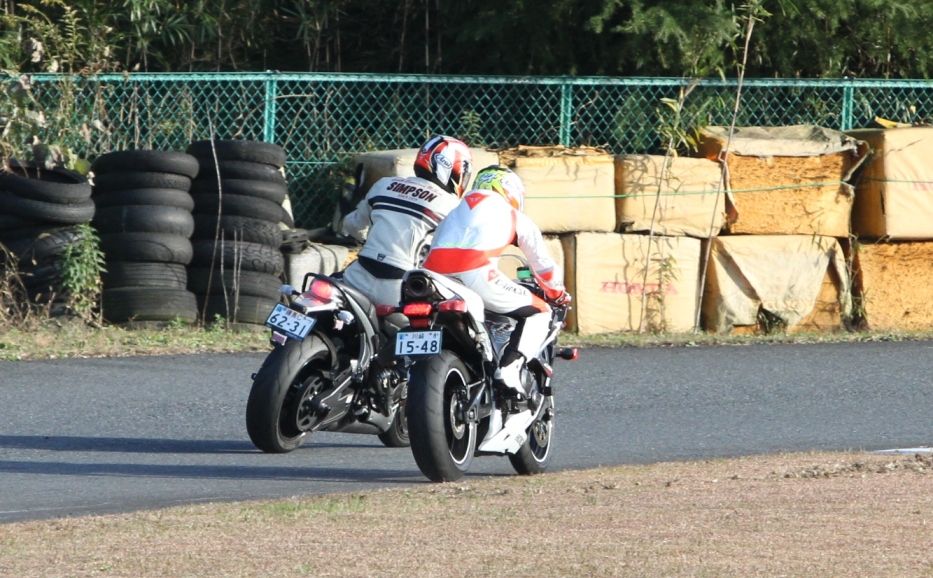 そのすぐ背後に初参加となる青木XB12SS、安倍CB400SF、片寄XB12SS、美濃部CBR600RR、高土CBR600RRと続くが………