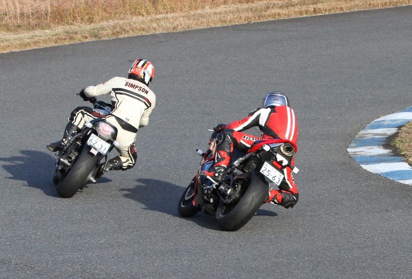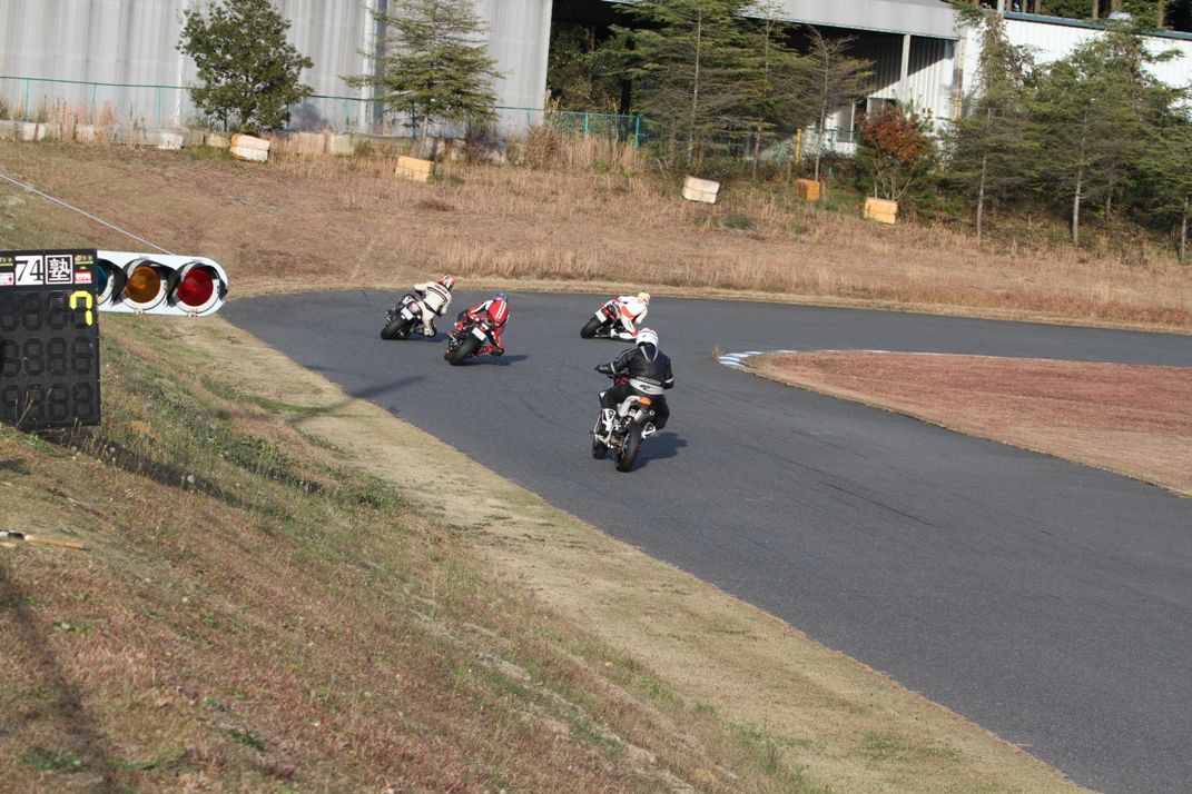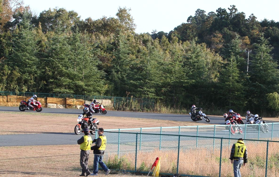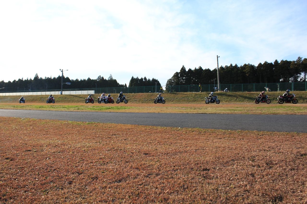 そのすぐ背後に初参加となる青木XB12SS、安倍CB400SF、片寄XB12SS、美濃部CBR600RR、高土CBR600RRと続くが………