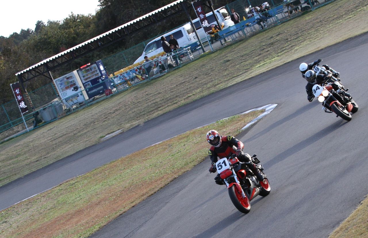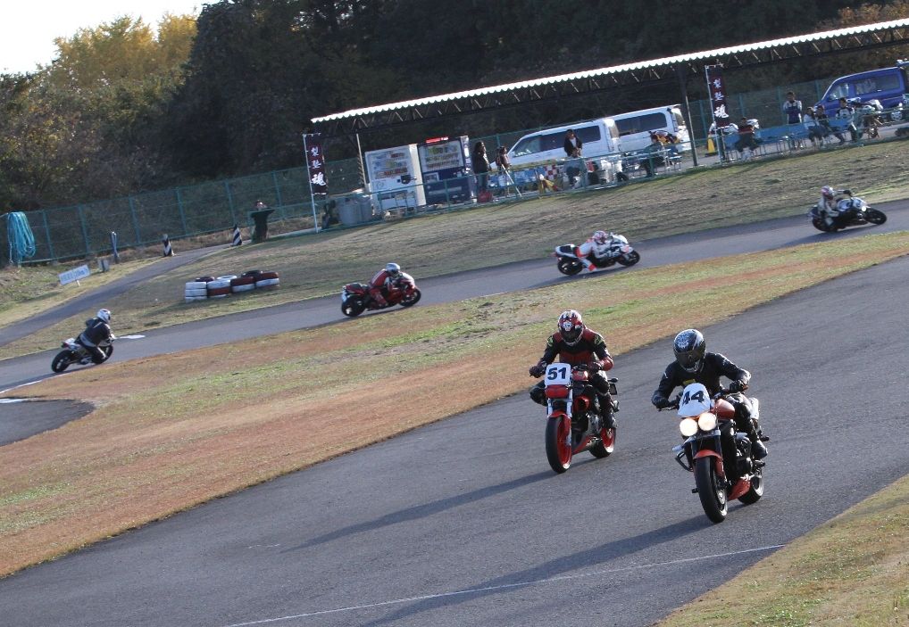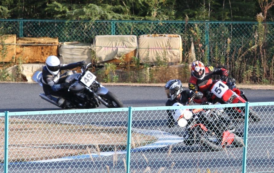 やや膨らんだ美濃部のイン側に松野SMR449、そして山田CBR600RRが入り込む。さらにその後方には望月Z1000、村雲ZX6R、斉藤NSR250R。