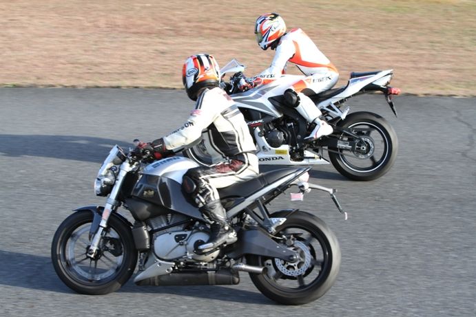 ニッキー・ヘイデンのようにがっちりと肩の入ったライディングフォームでトラクションをかけていく青木XB12SS。この滑りやすい3コーナー立ち上がりでは、サンダストームVツインが優位に働くようだ。