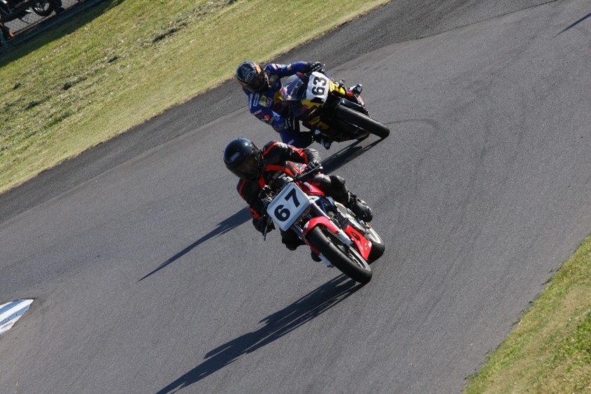 その後方ではこの集団に追いついた平沼GSXR1000が一気に五十嵐CBR250Rのインサイドへ。