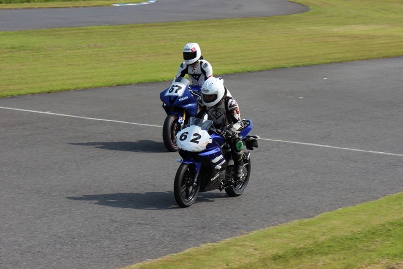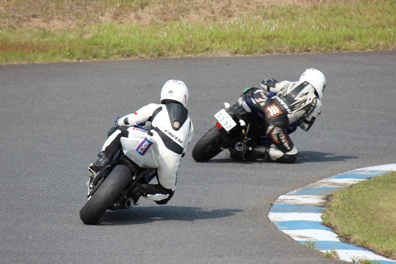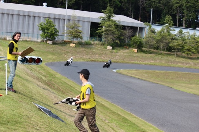 その松木とまったくの同一カラーで追うのは中村。ちなみに同じアライヘルメット、ツナギも同メーカーのもののようだ。なんとか逆転して初勝利をモノにしたいところ。