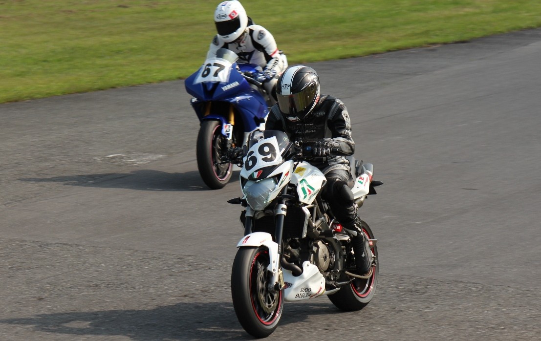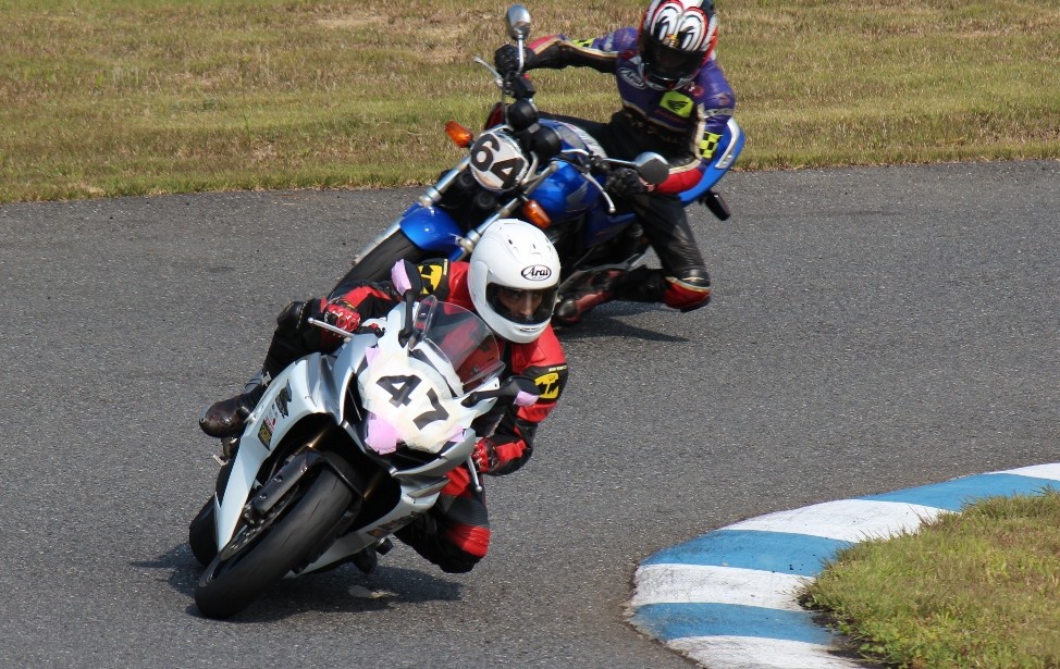 一度ポジションを奪われた梨本CB400SFが早くも帝王コーナー進入で平沼GSXR1000のインを狙う。